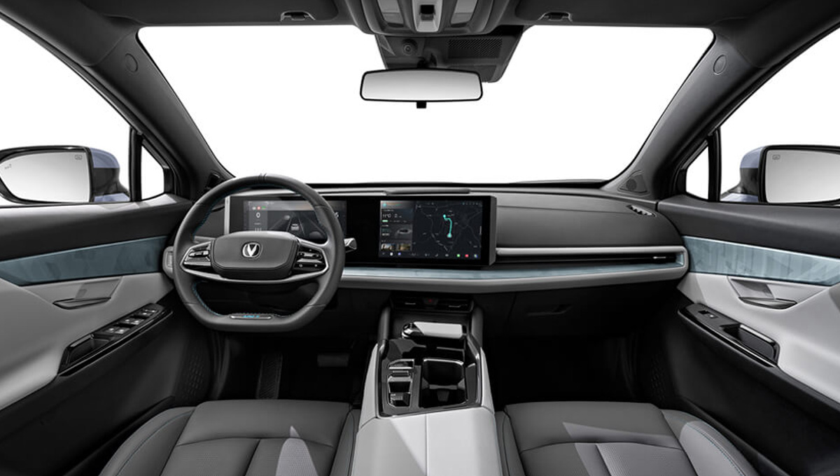 The Changan UNI-T’s cabin matches its exterior in boldness and innovation. An asymmetric dashboard flows toward the driver, anchored by a twin-screen layout, fighter jet–inspired electronic shifter, and distinctive metallic-finish controls, creating a sci-fi ambiance. Soft-touch materials dominate the upper dash, complemented by fine stitching and carbon-fiber-textured trim, resulting in a premium tactile experience.