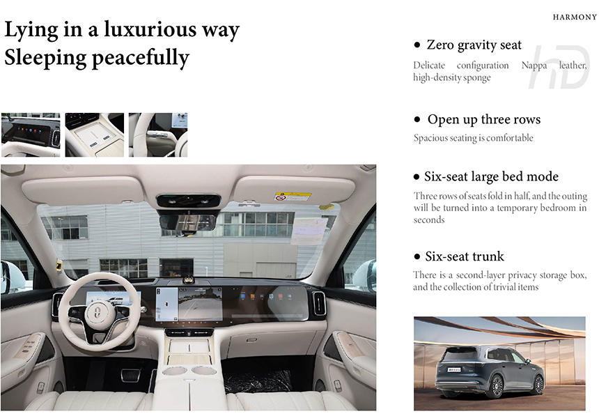 The AITO M8's cabin is a sanctuary of intelligent luxury, centered on an immersive next-generation HarmonyOS smart cockpit with a panoramic digital interface. It offers first-class Executive Rear Seats featuring extensive adjustability, massage, and advanced comfort functions for ultimate relaxation. Meticulously crafted with sustainable premium materials and ambient lighting, it creates a serene, acoustically optimized environment. This design seamlessly merges cutting-edge connectivity with unparalleled physical comfort for all occupants.