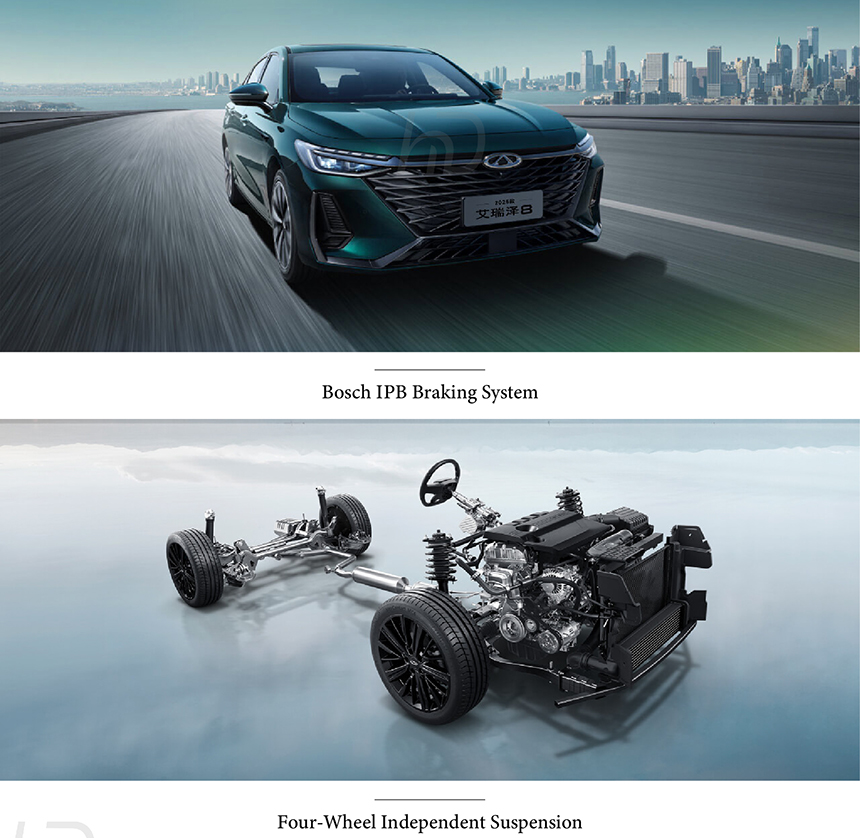 At the heart of the Chery Arrizo 8's performance lies the powerful Kunpeng 2.0TGDI Turbocharged Engine, delivering responsive acceleration and robust output. For confident stopping power and precise pedal feel, it is equipped with the advanced Bosch IPB Braking System. This combination ensures a balanced and secure driving dynamic, whether navigating city streets or highways. The result is an engaging yet refined driving experience.