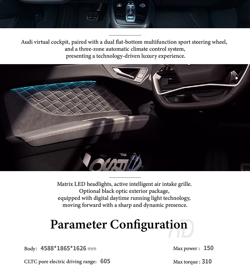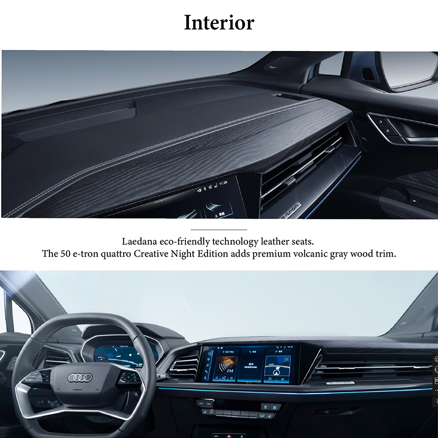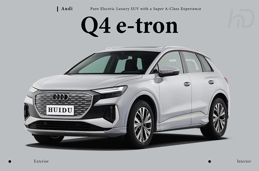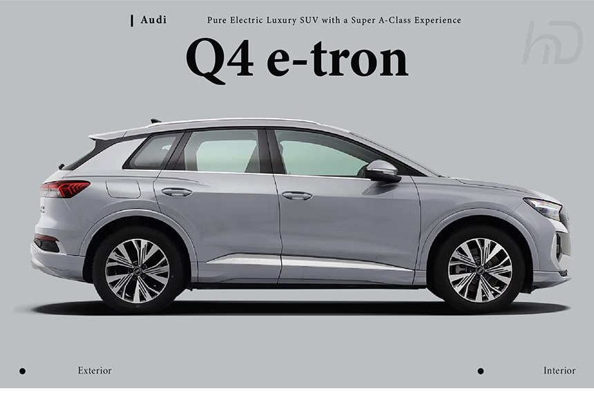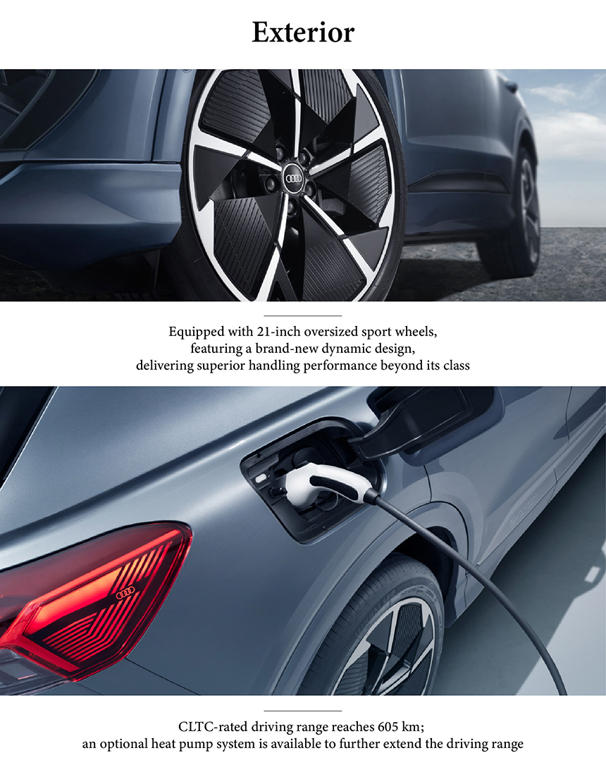 The Audi Q4 e-tron showcases a modern and dynamic electric SUV design that exudes a confident road presence. It is distinctively equipped with 21-inch oversized sport wheels and features a brand-new, sharp aerodynamic design language. This combination, along with a precisely tuned suspension, delivers superior handling and driving performance that surpasses typical class expectations. The overall aesthetic masterfully blends Audi's signature elegance with a sporty and futuristic character.