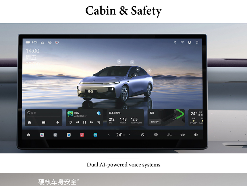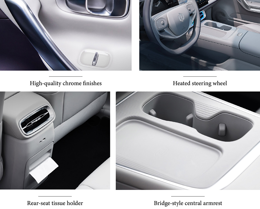 The interior of the Leapmotor B01 exudes a sense of refined luxury, highlighted by meticulous high-quality chrome finishes that add elegant accents throughout the cabin. For enhanced comfort in all seasons, it features a practical heated steering wheel, ensuring a warm grip during cold weather. A distinctive functional element is its bridge-style central armrest, which provides ample storage and a sleek, cohesive console design. These details work in harmony to create an environment that balances sophisticated aesthetics with everyday comfort and convenience.