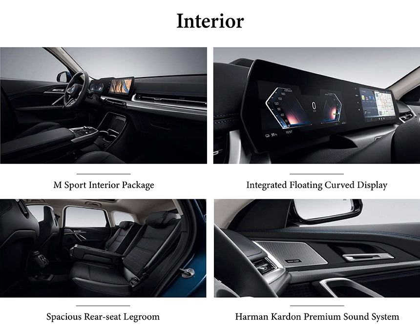 The BMW X1's cabin is defined by a driver-focused Dynamic Interior Design, emphasizing sporty contours and an engaging layout. At its heart lies the state-of-the-art Integrated Floating Curved Display, seamlessly merging the digital instrument cluster and touchscreen into a single, intuitive unit. Control is enhanced by the M Sport Multi-functional Leather Steering Wheel, offering premium tactile feedback and quick-access buttons. This combination creates a technologically advanced and thoroughly modern environment that prioritizes both connectivity and an active driving experience.