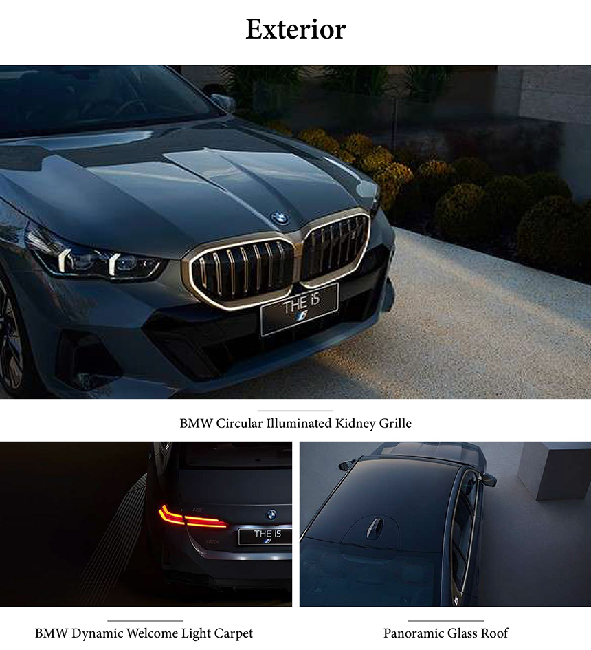 The BMW i5's front is dominated by the iconic Circular Illuminated Kidney Grille, which serves as both a bold statement and a sophisticated digital canvas. Its elegant silhouette is accentuated by a sleek Panoramic Glass Roof, enhancing the sense of space and openness within the cabin. Dynamic character lines flow from the illuminated grille over the glass roof toward the muscular rear, creating a cohesive and progressive profile. This harmonious blend of distinctive lighting signatures and expansive glass elements defines the i5's modern, luxurious, and forward-looking presence on the road.