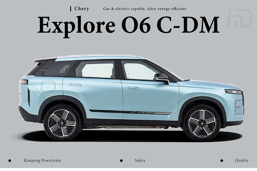 The Chery Tiggo 6 C-DM is a robust hybrid SUV featuring modern, off-road styling. Inside, its intelligent cockpit is powered by an 8155 AI chip and a 540° HD panoramic imaging system. Safety is ensured by an 80% high-strength steel body and all-round battery protection. Its core is the Kunpeng C-DM system, offering a 1300+ km range and exceptional efficiency.