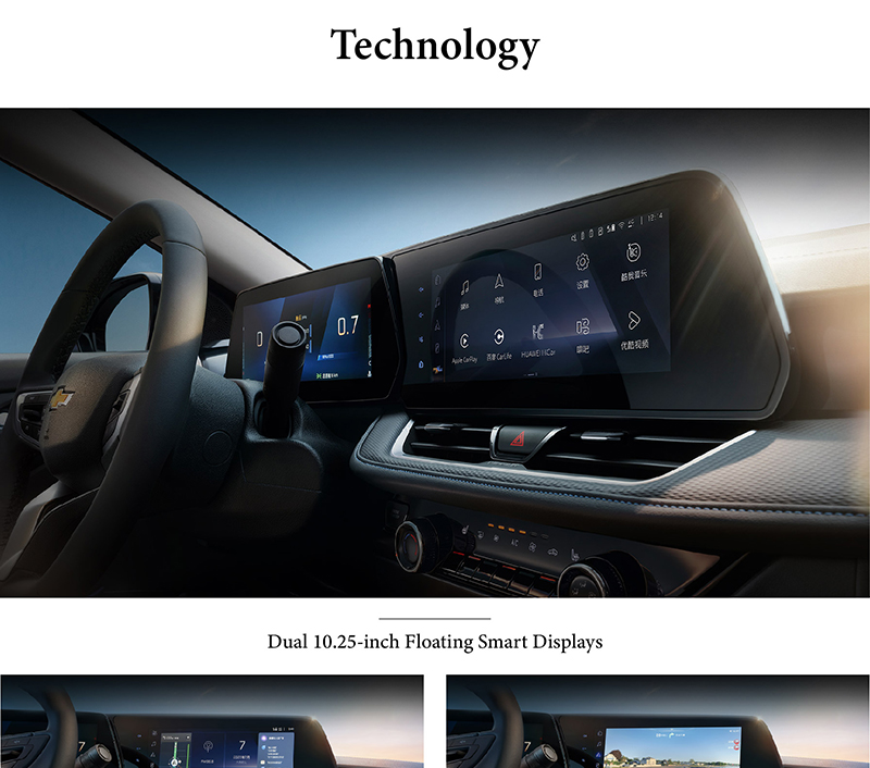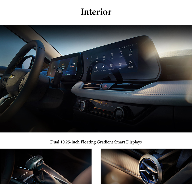 The Chevrolet Monza's cabin is anchored by Dual 10.25-inch Floating Smart Displays, seamlessly integrating the digital instrument cluster and infotainment screen into a sleek, driver-focused interface. Its Intelligent Voice Interaction Assistant enables natural, hands-free control of navigation, media, and climate settings, understanding context for a more intuitive experience. The system further enhances driving confidence with AR Intelligent Navigation, overlaying real-time guidance and directional prompts onto the live camera feed for precise, easy-to-follow routes. Together, these technologies form a truly connected, intelligent cockpit that prioritizes convenience, safety, and a modern digital experience.