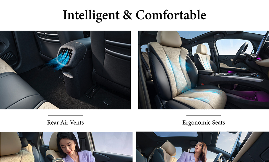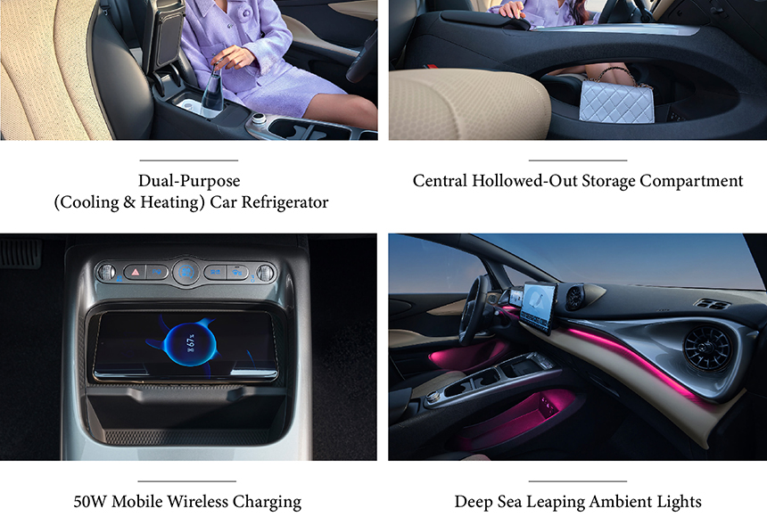 The BYD Dolphin Intelligent Driving Edition's cabin is crafted for comfort and daily convenience. It is equipped with ergonomic seats designed for excellent support and reduced fatigue on longer drives. A standout feature is the versatile dual-purpose (cooling & heating) car refrigerator, perfect for keeping snacks and drinks at the ideal temperature. These thoughtful amenities create a practical and pleasant environment for both commutes and road trips.