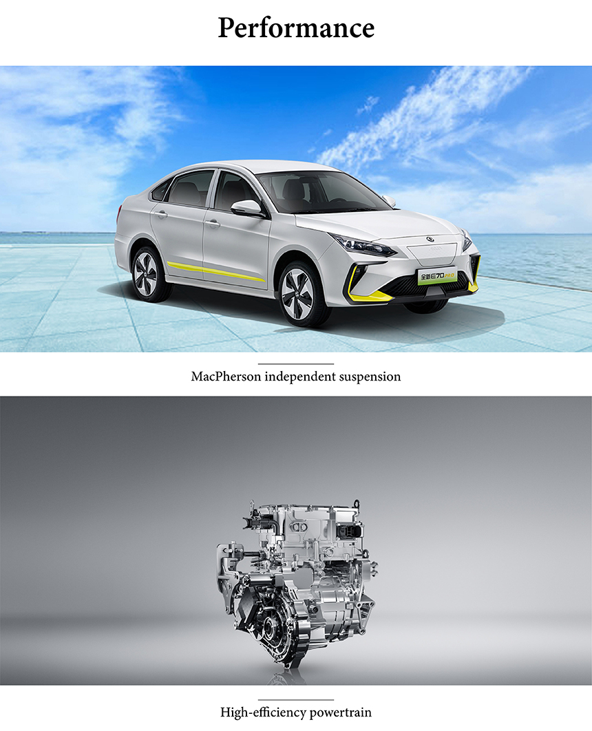 The Dongfeng Aeolus E70 delivers a refined driving experience, beginning with a MacPherson independent suspension system that strikes an ideal balance between agile handling and ride comfort. Its High-efficiency powertrain maximizes energy utilization, offering responsive acceleration while maintaining optimal electric range for daily commuting. Together, these technologies provide a smooth, composed ride across varied road conditions, enhancing driver confidence and passenger comfort. The result is a well-rounded electric vehicle that prioritizes both dynamic capability and everyday practicality.