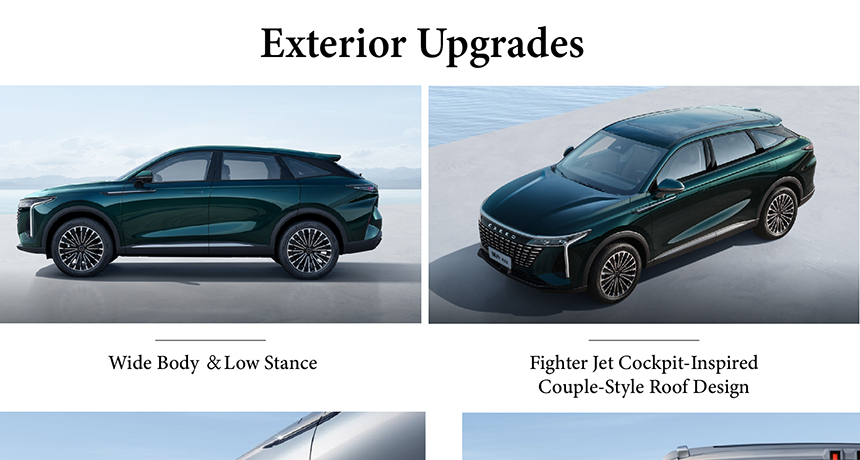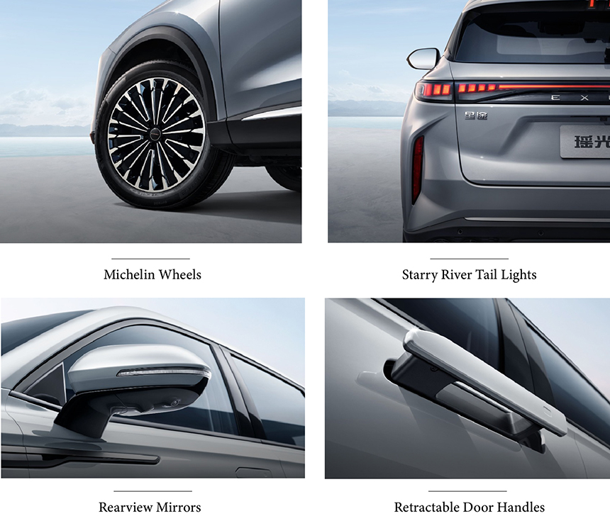 With a wide body and low stance, the Chery Exeed Yaoguang delivers a planted, performance-oriented presence on the road. It rides on distinctive Michelin wheels, enhancing both grip and visual dynamism. The fighter jet cockpit-inspired couple-style roof design flows seamlessly into the rear, creating a sleek, aerodynamic fastback silhouette. This bold combination results in an exterior that is both aggressive and elegantly streamlined.