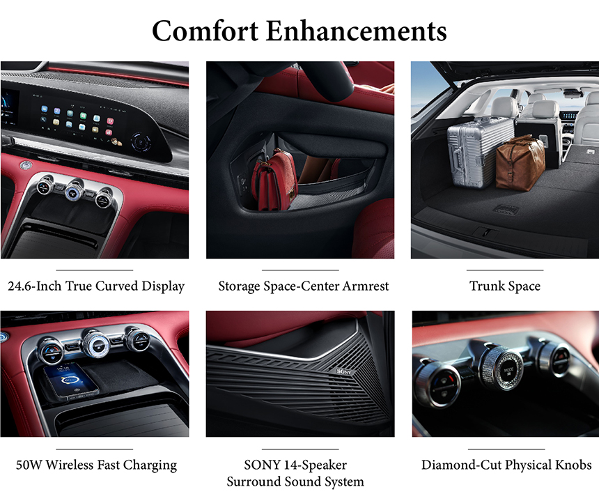 The Exeed Yaoguang's cockpit is centered around a breathtaking 24.6-inch true curved display, creating an immersive and futuristic digital environment. For ultimate convenience, it features a 50W wireless fast charging pad, ensuring devices are powered rapidly without cables. Thoughtful design is evident in the precision of its diamond-cut physical knobs, offering intuitive control with satisfying tactile feedback. This blend of expansive digital interfaces and high-quality physical elements defines a cabin that is both technologically advanced and driver-focused.