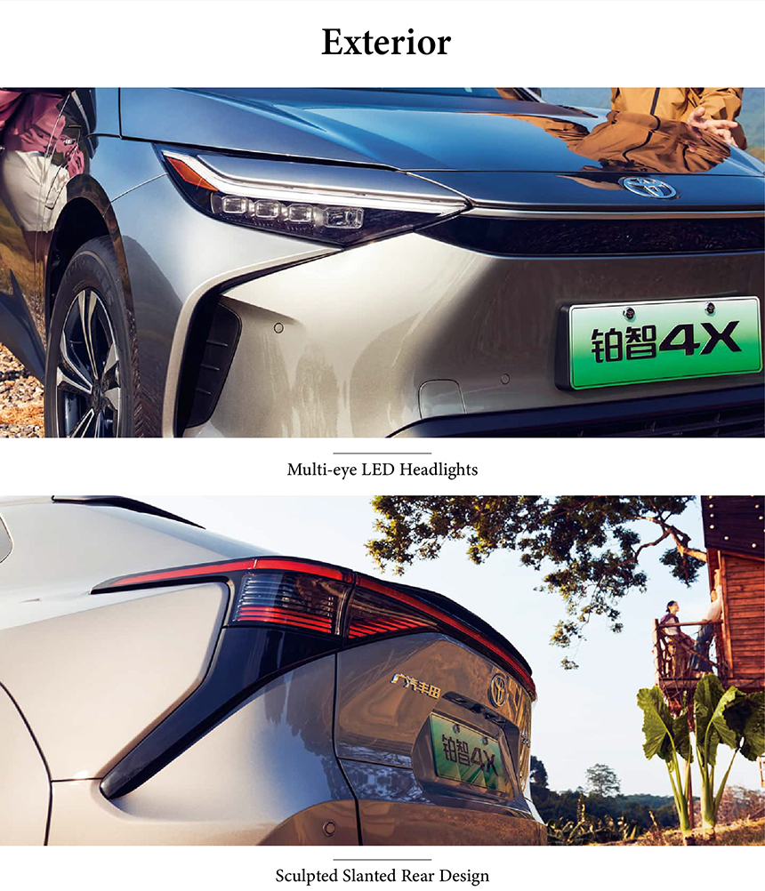 The Toyota bZ4X presents a bold and distinctive front fascia, anchored by sharp Multi-eye LED Headlights that convey a futuristic and alert expression. Its profile is defined by robust character lines and pronounced wheel arches, emphasizing a capable SUV stance. The rear features a dramatic Sculpted Slanted Rear Design with a unique roofline spoiler, enhancing both aerodynamics and visual dynamism. Together, these elements create a cohesive and adventurous exterior identity, signaling a new direction for Toyota's electric design language.