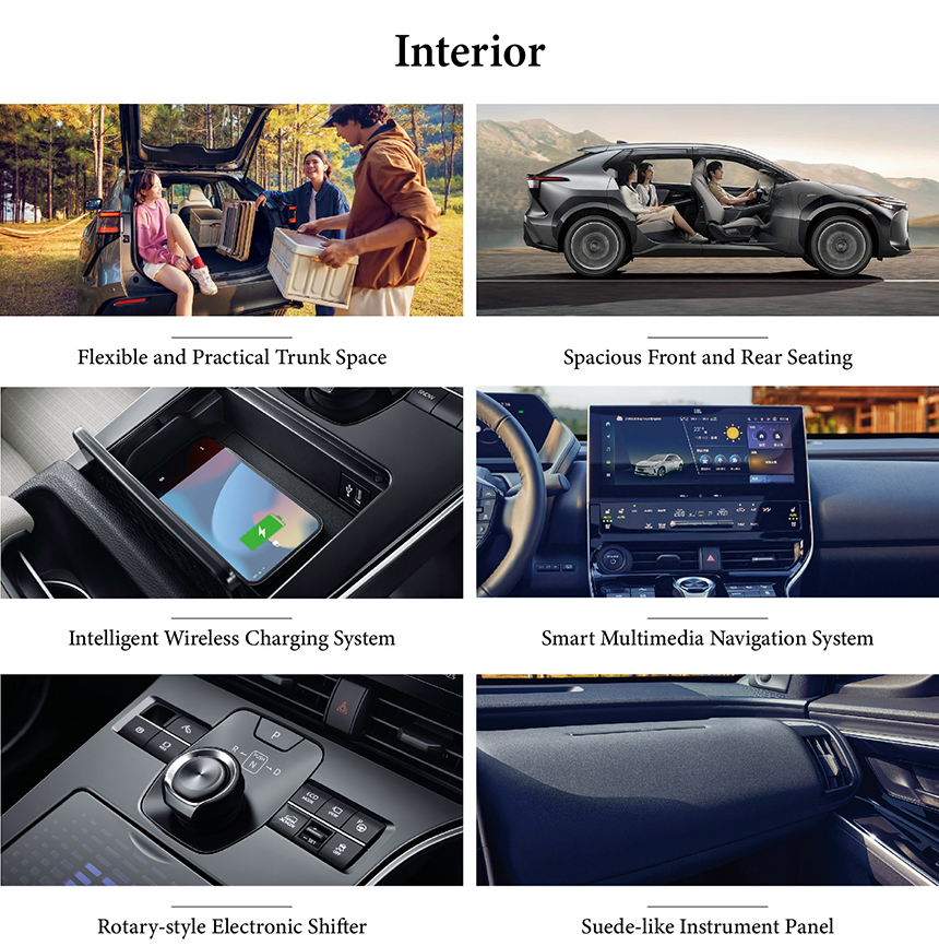 The Toyota bZ4X offers a versatile interior highlighted by Flexible and Practical Trunk Space, easily adapting to various cargo and lifestyle needs. Convenience is elevated with an Intelligent Wireless Charging System, allowing seamless device power without cable clutter. The driving experience is enhanced by a modern Rotary-style Electronic Shifter, providing intuitive and precise gear selection with a premium tactile feel. Together, these features create a thoughtfully designed cabin that balances everyday utility with contemporary, connected comfort.