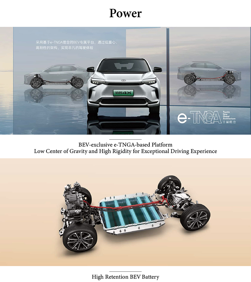 The Toyota bZ4X is built on the dedicated BEV-exclusive e-TNGA-based Platform, providing an optimal foundation for electric performance. Its engineering achieves a Low Center of Gravity and High Rigidity, delivering agile handling, exceptional stability, and a refined driving experience. The advanced powertrain is complemented by a High Retention BEV Battery, engineered for long-term durability and sustained capacity over years of use. Together, these elements ensure a dynamic, confident, and enduring electric driving experience that remains engaging for the lifetime of the vehicle.