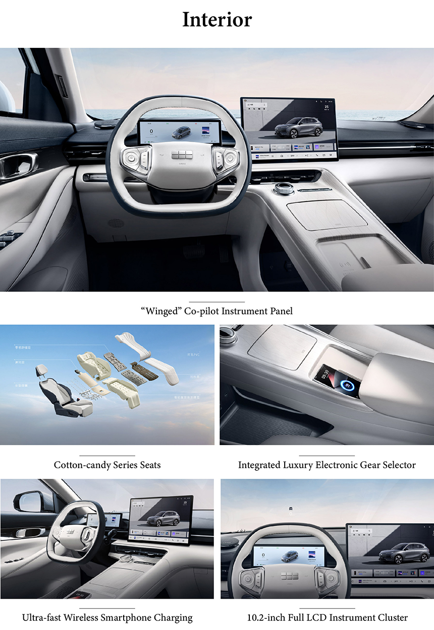 The interior of the Geely Galaxy E5 embraces a harmonious and driver-centric philosophy, where the graceful "Winged" Co-pilot Instrument Panel sweeps across the dashboard, integrating key functions and ambient lighting. It offers exceptional comfort with the uniquely designed Cotton-candy Series Seats, featuring a soft, breathable cloud-like embrace for a relaxing journey. At the center console, the sleek Integrated Luxury Electronic Gear Selector adds a touch of minimalist sophistication and precise tactile feedback. This blend of flowing design, supreme comfort, and refined technology defines a serene, modern, and intuitively connected cabin space.
