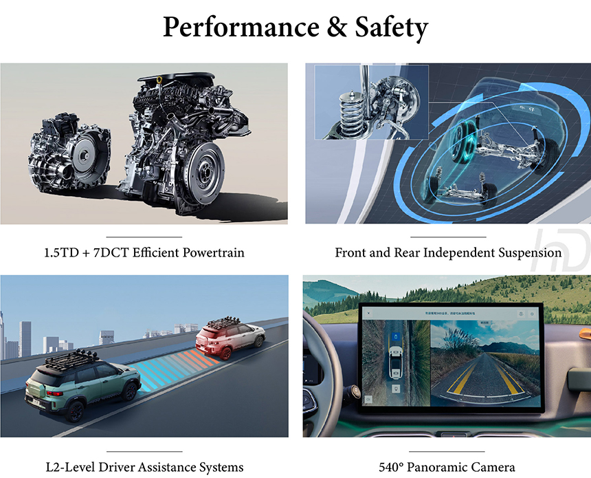 The Geely Cowboy is powered by the 1.5TD + 7DCT efficient powertrain, providing smooth acceleration and excellent fuel economy. Its balanced and comfortable ride is ensured by front and rear independent suspension, enhancing stability and handling on various road conditions. A key safety feature is its comprehensive L2-level driver assistance systems, offering adaptive cruise and lane-keeping support. This combination delivers a confident, economical, and secure driving experience for urban and light adventure use.
