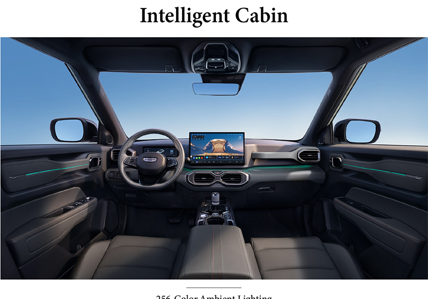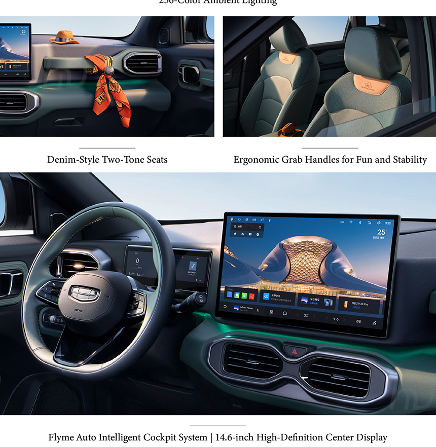 The interior of the Geely Cowboy is a high-tech interior, merging digital sophistication with comfortable practicality. A stylish highlight is the unique denim-style two-tone seats, blending rugged fabric inspiration with a modern, durable feel. At its core lies the seamless Flyme Auto intelligent cockpit system, providing a fluid interface for connectivity and control. Together, they create a uniquely contemporary and connected space for daily adventures.