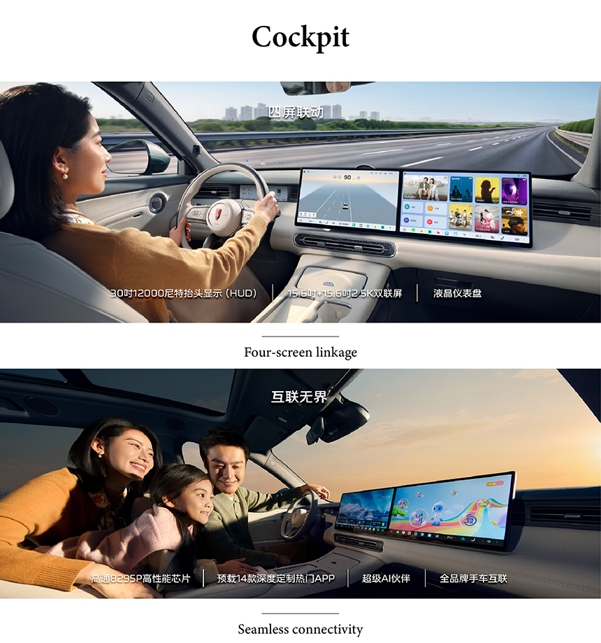 The Mazda EZ-6's cockpit is centered around an advanced Four-screen linkage system, creating an immersive and information-rich digital environment for both driver and front passenger. This technology enables seamless connectivity, allowing vital data, navigation, and entertainment to flow effortlessly across the displays. The integrated interface serves as a centralized hub, providing a streamlined experience that enhances both convenience and situational awareness. It redefines the in-car experience as intuitively connected and intelligently interactive.