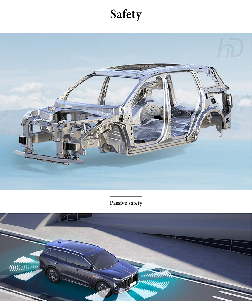 The Hongqi HS7 is built upon a comprehensive three-dimensional safety concept, integrating Passive Safety, Active Safety, and Battery Safety for holistic protection. Its passive safety relies on a high-strength body cage and multiple airbags, designed to maximize occupant protection during a collision. Active safety is achieved through an intelligent suite of driver-assistance systems, including predictive emergency braking and lane-keeping, to help prevent accidents. Exclusive battery safety technology ensures the stability and security of the high-voltage system under various conditions.