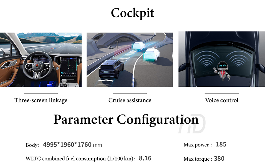 The Hongqi HS7 presents a majestic and elegant exterior design, exuding a commanding road presence. Its interior is crafted as a serene "pure, large, and quiet" space, enhanced by a technologically advanced three-screen linked cockpit with intelligent cruise assistance. Comprehensive safety integrates three layers: robust passive protection, proactive active systems, and dedicated battery safety technology. It is a full-featured luxury SUV that harmoniously blends sophisticated aesthetics, intelligent innovation, and all-around protection.