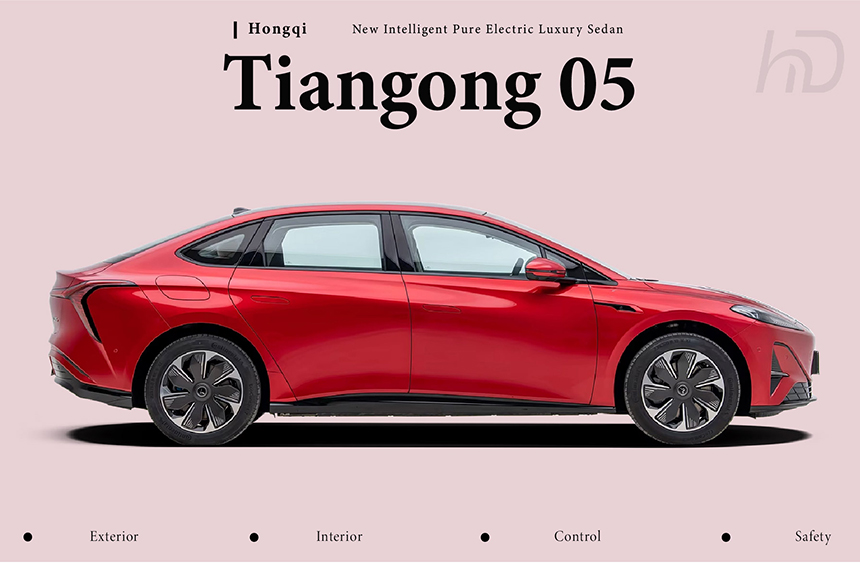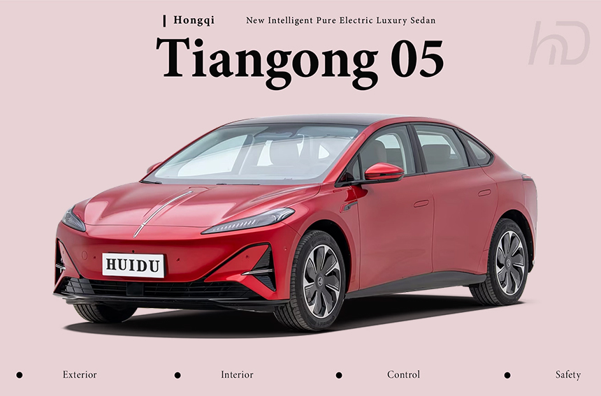 The Hongqi Tiangong 05 is a premium luxury sedan featuring a trend-forward aerodynamic design and signature Hongqi craftsmanship. Its intelligent core is the Hongqi Lingxi Smart Cockpit, supported by the advanced Hongqi Sinan Intelligent Driving System for a new-generation dynamic experience. Comprehensive safety is ensured by a robust body structure and proactive driver-assistance technologies. This combination of elegant aesthetics, cutting-edge intelligence, and solid protection defines its sophisticated positioning.