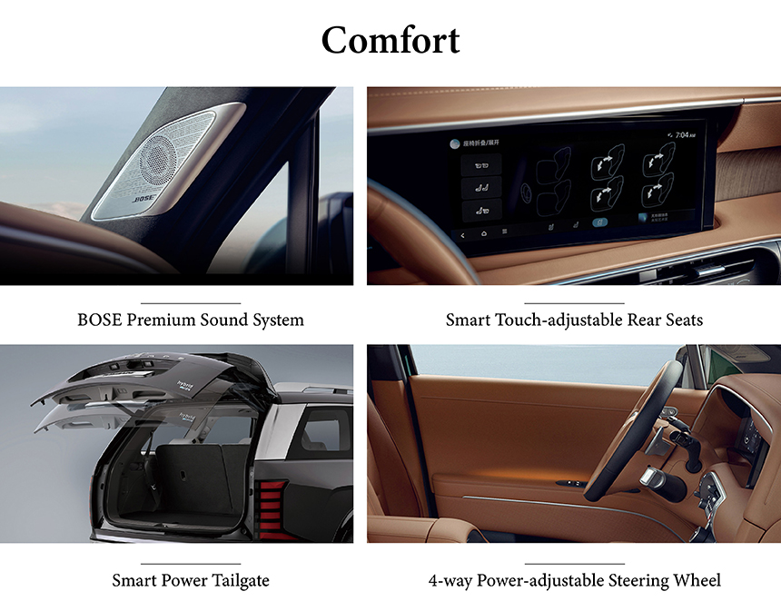 The Hyundai Palisade immerses occupants in premium audio with the BOSE® Premium Sound System, delivering rich, concert-quality acoustics throughout the cabin. Rear passengers enjoy personalized comfort thanks to Smart Touch-adjustable Rear Seats, allowing intuitive, one-touch control for optimal relaxation. Driver convenience is elevated with the 4-way Power-adjustable Steering Wheel, enabling effortless customization of driving position for enhanced ergonomics and control. Together, these features create an environment of refined luxury where intuitive technology seamlessly enhances every journey.