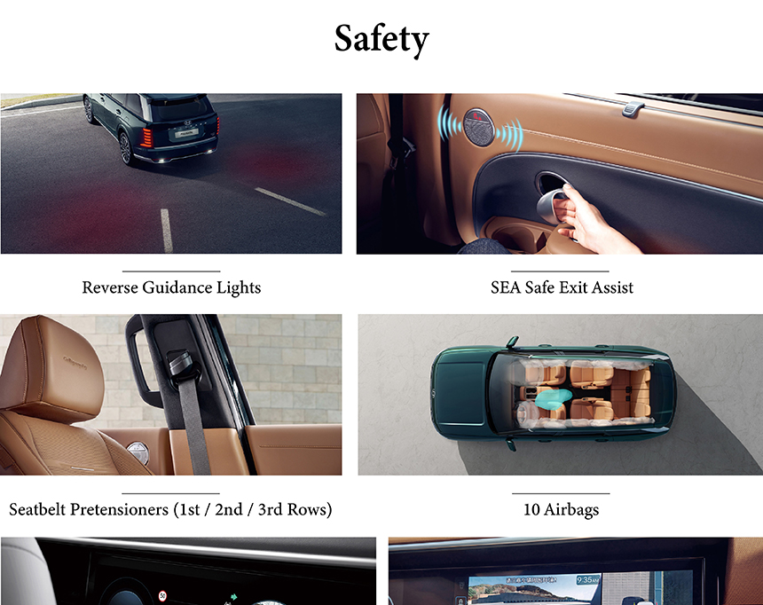 The Hyundai Palisade enhances nighttime maneuverability with Reverse Guidance Lights, illuminating the path behind for confident backing in low-light conditions. Occupant protection is elevated with Seatbelt Pretensioners (1st / 2nd / 3rd Rows), which instantly tighten belts across all three rows during a collision to secure passengers. A comprehensive 360° SVM Surround View Monitor provides a bird’s-eye perspective, eliminating blind spots and simplifying parking in tight spaces. Together, these integrated safety features deliver a multi-layered shield that prioritizes awareness, protection, and peace of mind for every journey.