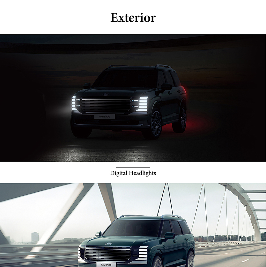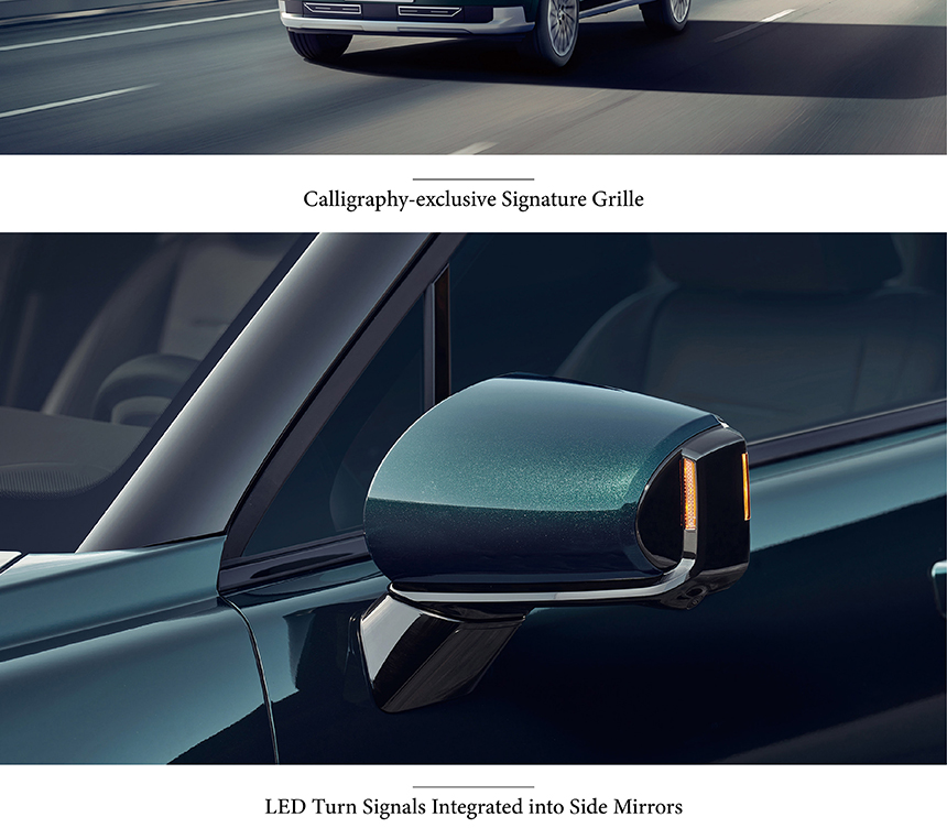 The Hyundai Palisade commands attention with its Full LED Projector Headlights, delivering sharp, precise illumination that enhances both style and visibility. Its imposing front fascia is anchored by the Calligraphy-exclusive Signature Grille, a distinctive mesh pattern that exudes premium craftsmanship and sophisticated presence. Attention to detail extends to the LED Turn Signals Integrated into Side Mirrors, seamlessly blending functionality with a clean, modern aesthetic. Together, these elements create a bold yet refined exterior that confidently asserts its flagship stature.