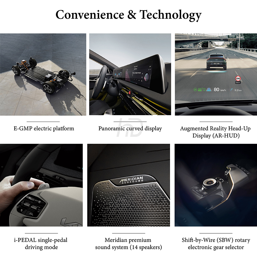 The Kia EV6 enhances daily convenience with intelligent technology, starting with its Augmented Reality Head-Up Display that projects turn-by-turn navigation directly onto the windshield. Its i-PEDAL single-pedal driving mode simplifies urban driving by allowing acceleration and deceleration primarily with one pedal. These systems work in concert to reduce driver distraction and effort, streamlining the interaction between driver and vehicle. Together, they deliver a more intuitive, focused, and effortlessly modern electric driving experience.