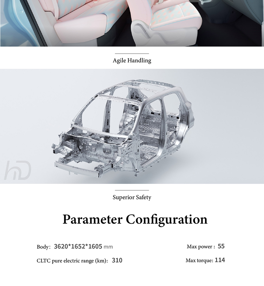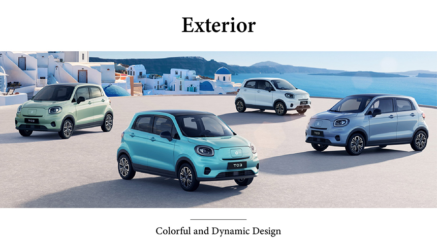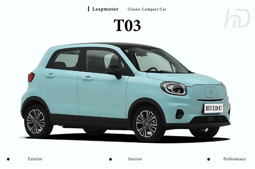 The Leapmotor T03 captivates with its colorful and dynamic design, offering a vibrant array of exterior colors that highlight its youthful and energetic character. Its compact form is defined by smooth, flowing curves and a friendly yet modern front fascia with large, expressive headlights. The overall silhouette is both agile and stylish, perfectly suited for urban navigation. This cheerful and approachable aesthetic makes it a standout choice for city driving and personal expression.