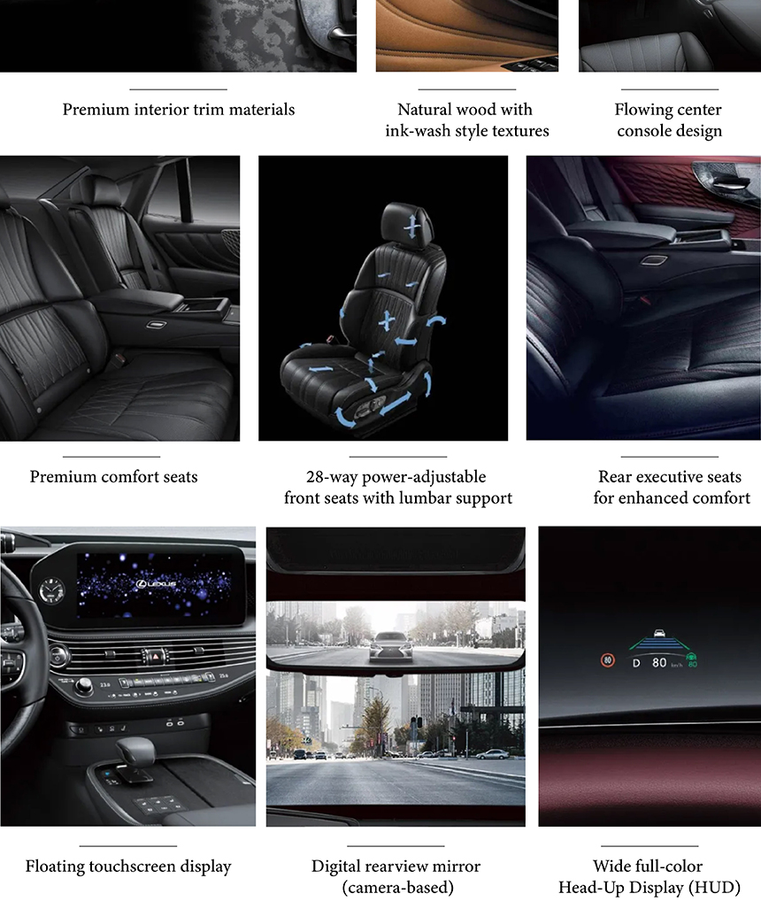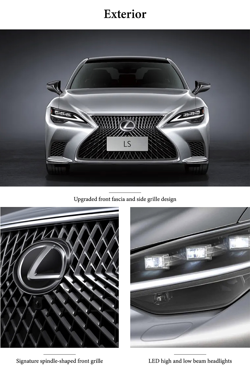 The Lexus LS presents an elegant and authoritative flagship silhouette, blending sophisticated proportions with a commanding presence. Its front is defined by the iconic signature spindle-shaped front grille, meticulously crafted for a bold yet refined expression. Enhancing this are the details of the upgraded front fascia and side grille design, which add further depth and modern intricacy. This harmonious evolution of design language masterfully balances timeless luxury with contemporary artistry.