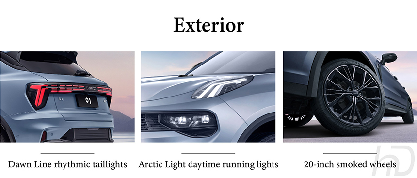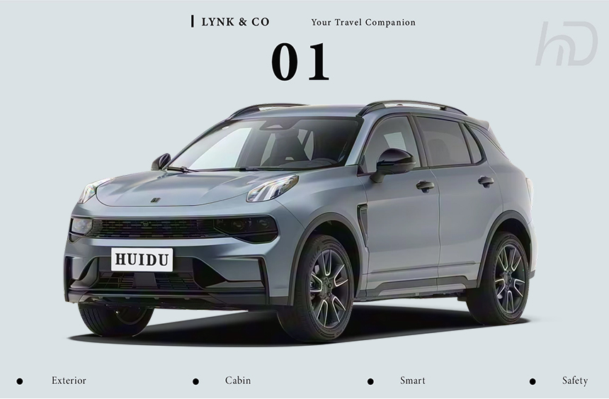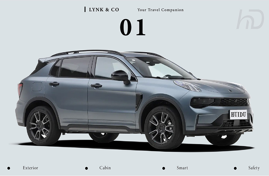 The Lynk & Co 01 presents a sharp and contemporary design, instantly recognizable by its signature Arctic Light daytime running lights that slice through the front fascia with a crisp, high-tech glow. At the rear, the distinctive Dawn Line rhythmic taillights create a dynamic, flowing illumination pattern. These lighting signatures bookend a sculpted and muscular SUV silhouette. Together, they forge a cohesive and technologically expressive visual identity, both day and night.
