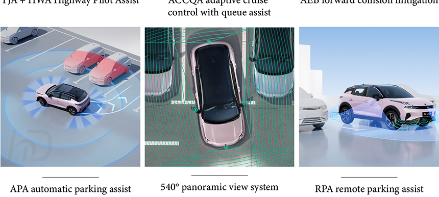 The Lynk & Co 06 elevates driving intelligence with its TJA + HWA Highway Pilot Assist system, enabling seamless lane keeping and automatic speed adjustment for stress-free highway journeys. Its advanced ACCQA adaptive cruise control with queue assist maintains optimal following distance in congested traffic, bringing the vehicle to a complete stop and automatically resuming when traffic moves. The innovative RPA remote parking assist allows drivers to safely park or retrieve their vehicle from outside using a smartphone, particularly useful in tight spaces. These integrated technologies work in harmony to create a comprehensive intelligent driving ecosystem that enhances both convenience and safety.