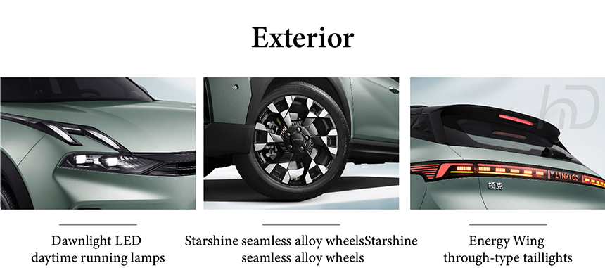 The Lynk & Co 06 captivates with its signature Dawnlight LED daytime running lamps, creating a distinctive lighting signature that blends Scandinavian minimalism with technological sophistication. The striking Energy Wing through-type taillights span the entire rear width, delivering a dynamic illumination pattern that ensures instant recognition. Precision-engineered Starshine seamless alloy wheels combine aerodynamic efficiency with visual elegance, completing the vehicle's athletic stance. These design elements work in harmony to establish a cohesive aesthetic language that balances urban refinement with dynamic presence.