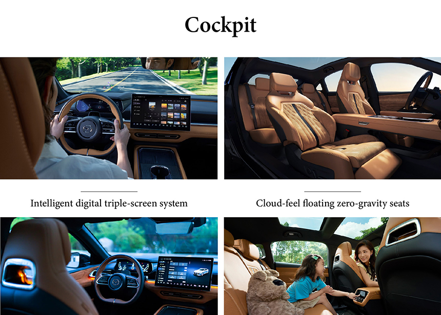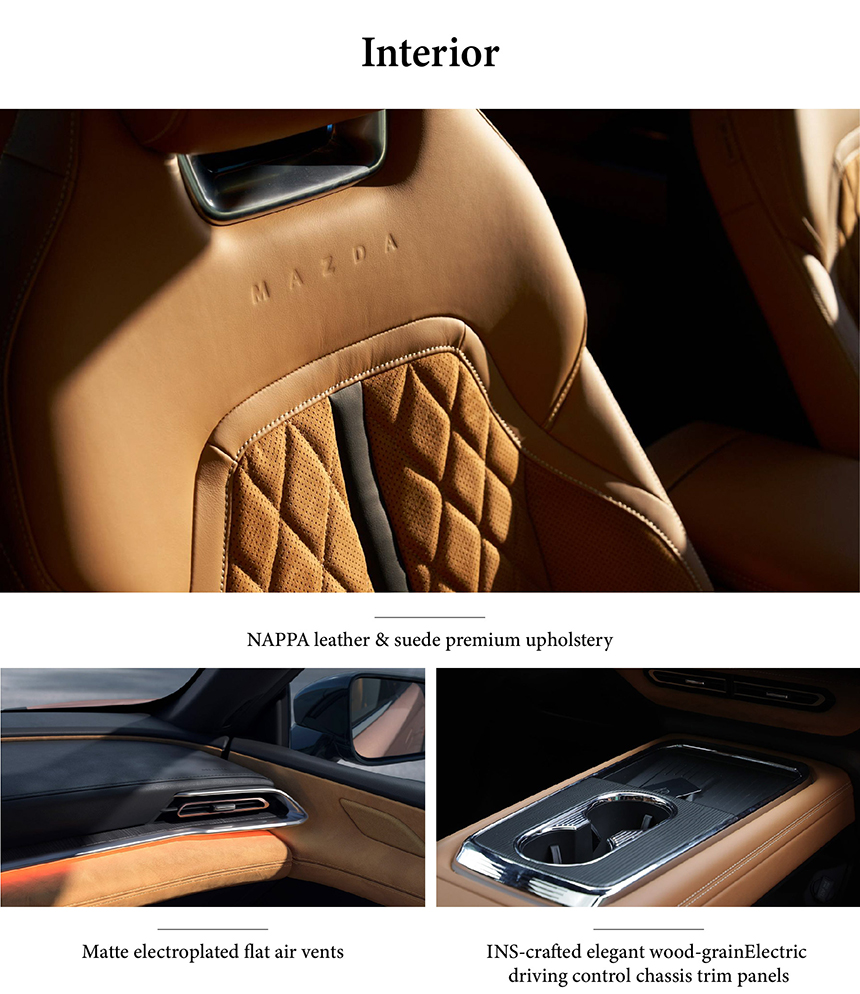 The interior of the Mazda EZ-6 exemplifies modern luxury, meticulously crafted with NAPPA leather & suede premium upholstery for an exceptional tactile experience. Sophisticated details like Matte electroplated flat air vents add a refined, technical accent throughout the cabin. The ambiance is elevated by NS-crafted elegant wood-grain trim panels, which bring natural warmth and artistry to the driver's environment. These elements, combined with the intuitive Electric driving control chassis, create a driver-focused sanctuary that balances sophisticated craftsmanship with advanced technology.