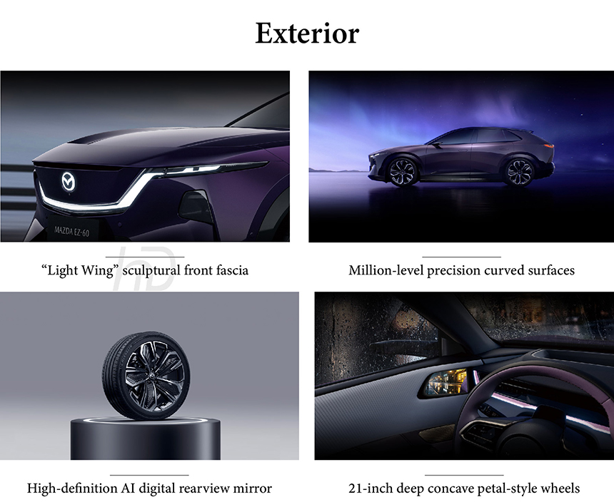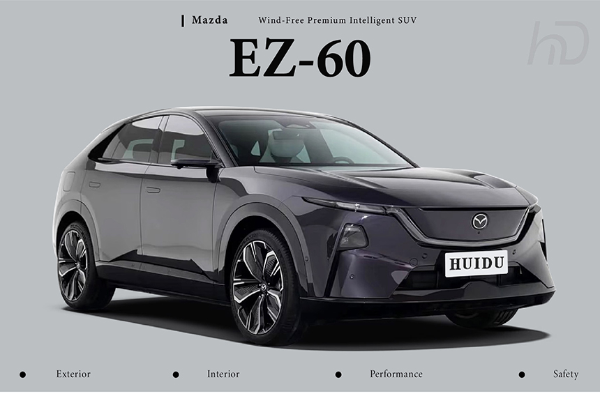 The Mazda EZ-60 features a sculptural "Light Wing" front fascia and precision curved surfaces, enhanced by intelligent technology like a high-definition AI rearview mirror. Its interior offers a serene light-luxury color scheme, premium craftsmanship, and a 23-speaker audio system for a refined atmosphere. Performance is delivered through a smooth range-extender dual powertrain and fast-charging battery, ensuring efficiency and flexibility. Comprehensive safety includes nine standard airbags and reinforced A-pillars, providing confidence and protection on every journey.
