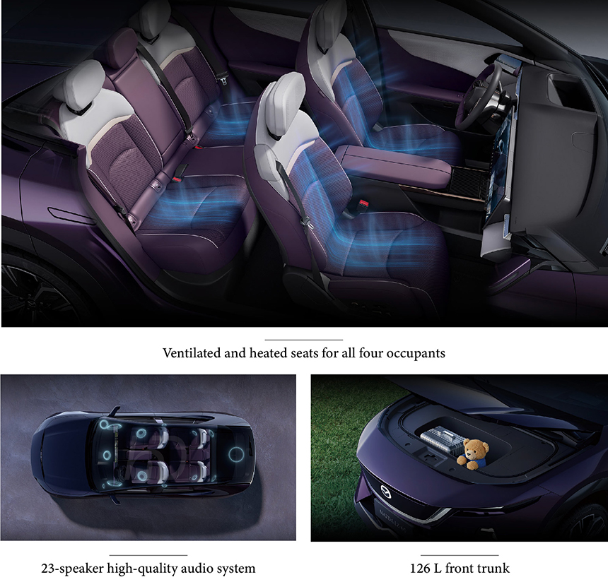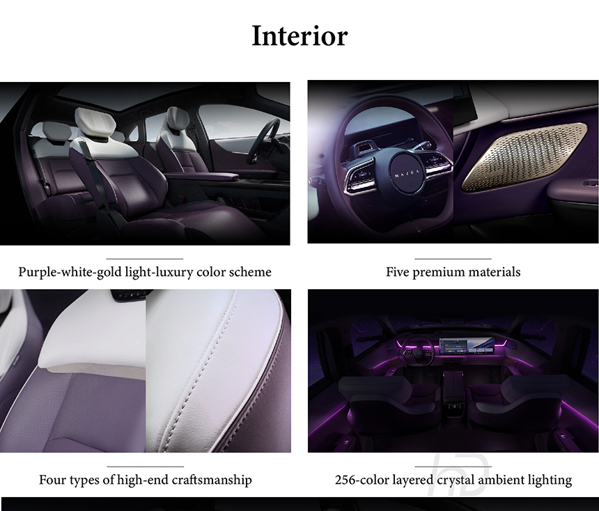 The Mazda EZ-60's cabin introduces a serene purple-white-gold light-luxury color scheme, creating a sophisticated and calming ambiance. It employs four types of high-end craftsmanship, combining premium materials and textures for a deeply tactile experience. An immersive 23-speaker high-quality audio system ensures concert-like sound reproduction throughout the interior. These elements work in harmony to establish a uniquely tranquil, refined, and sensory-rich personal sanctuary.