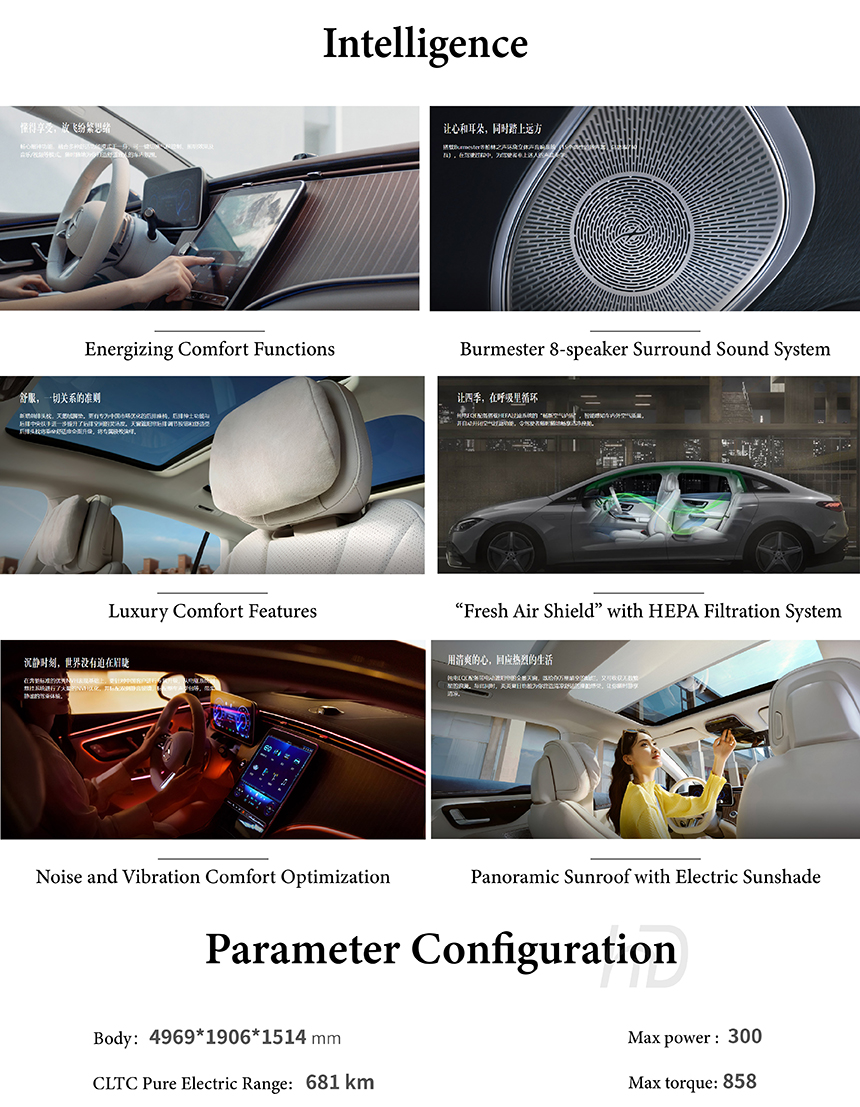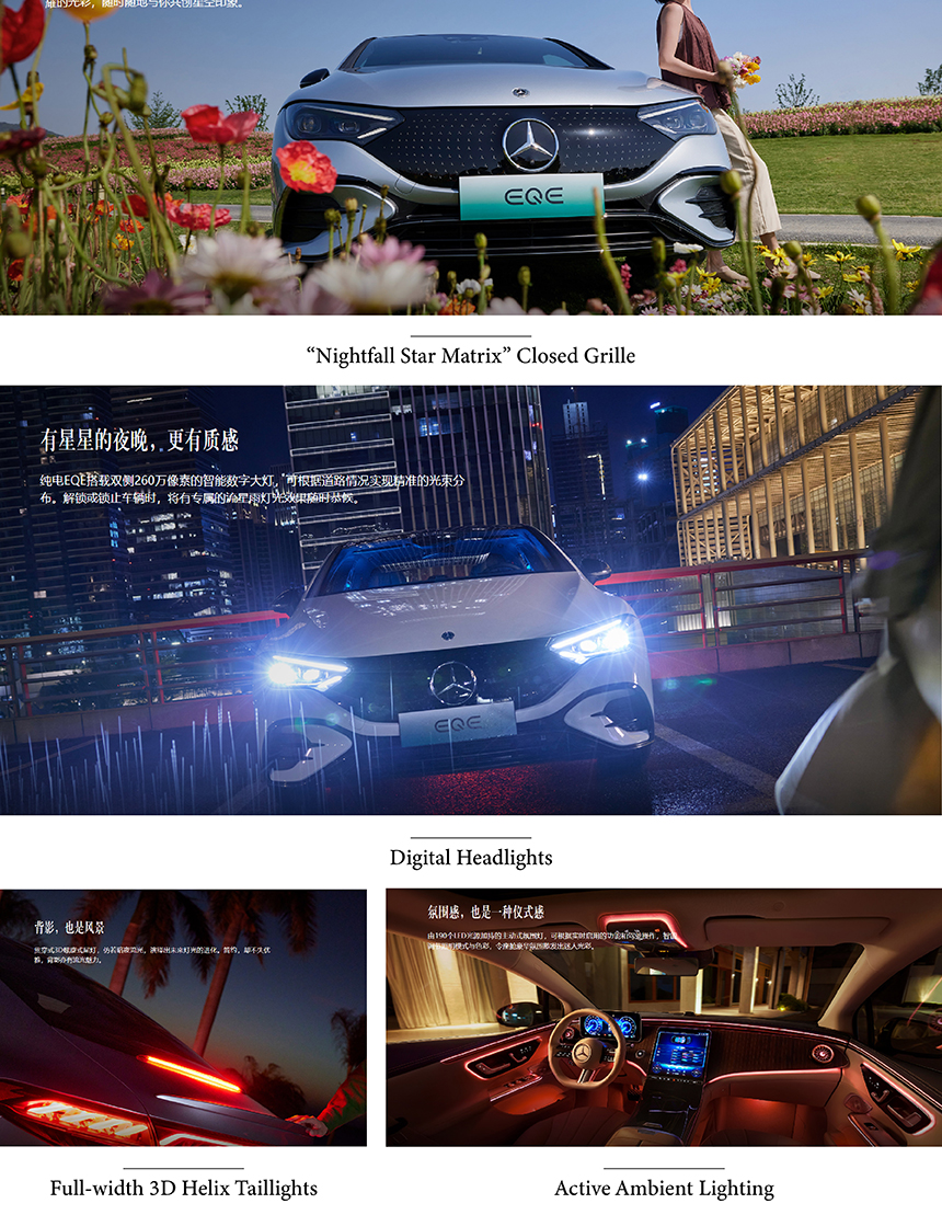 The Mercedes-Benz EQE showcases a seamless bow-shaped body design with intelligent digital headlights and active ambient lighting, creating an elegantly aerodynamic electric luxury sedan. Its tech-forward cabin features a 5G communication module, L2 Intelligent Navigation Assist Pro, and AR real-scene navigation for an intuitively connected driving experience. Safety is anchored by a robust battery protection system, comprehensive airbag coverage, and advanced driver assistance technologies that deliver confident, proactive protection. Intelligent performance includes a standard dual-motor system, in-house battery management, and an impressive 681 km CLTC range, combining efficiency with refined electric luxury.