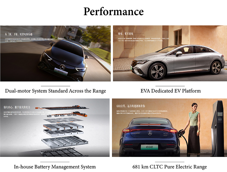 The Mercedes-Benz EQE delivers uncompromising performance with a Dual-motor System Standard Across the Range, ensuring precise all-wheel drive dynamics and instantaneous torque response. Its In-house Battery Management System intelligently optimizes energy flow, thermal regulation, and charging efficiency for sustained reliability. Backed by an impressive 681 km CLTC Pure Electric Range, it offers extended journeys with fewer charging stops. Together, these technologies create a refined electric driving experience that seamlessly blends power, efficiency, and long-distance capability.