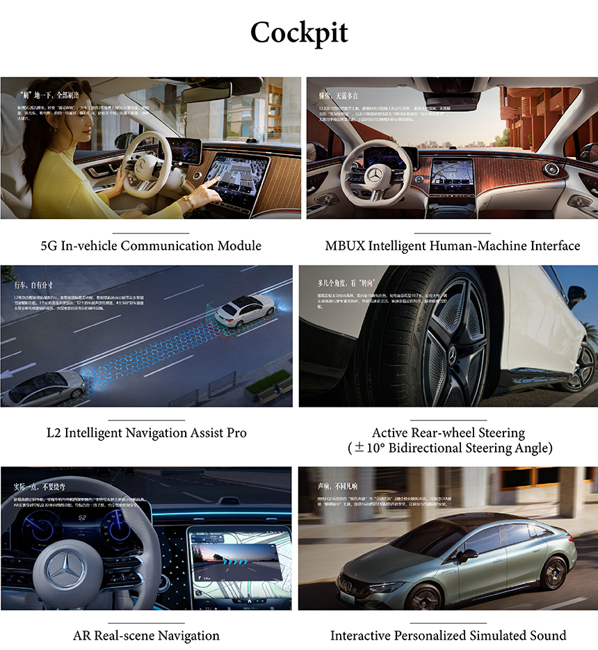 The Mercedes-Benz EQE's cockpit is powered by a 5G In-vehicle Communication Module, enabling ultra-fast data transfer, seamless cloud connectivity, and real-time service updates. Its L2 Intelligent Navigation Assist Pro combines adaptive cruise control with lane guidance and automated lane changes for confident, partially automated highway driving. Navigation precision is elevated by AR Real-scene Navigation, which overlays dynamic directional arrows onto live camera footage of the road ahead. Together, these technologies create a seamlessly connected, intuitively guided, and intelligently assisted driving experience.