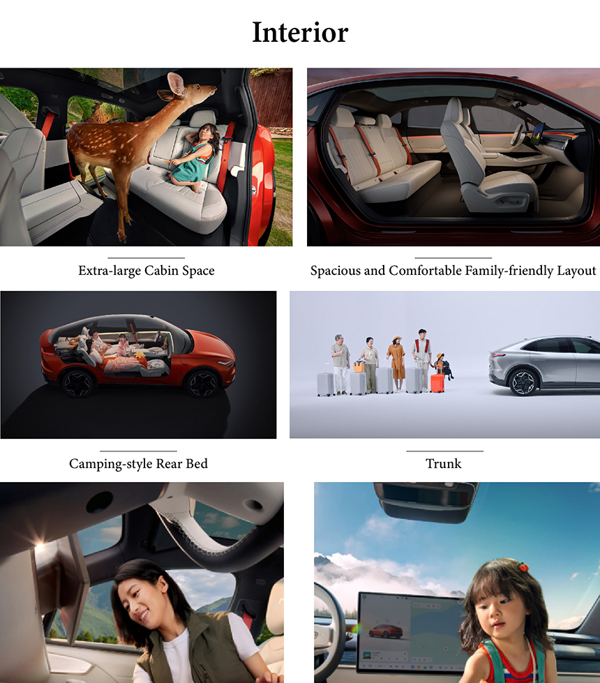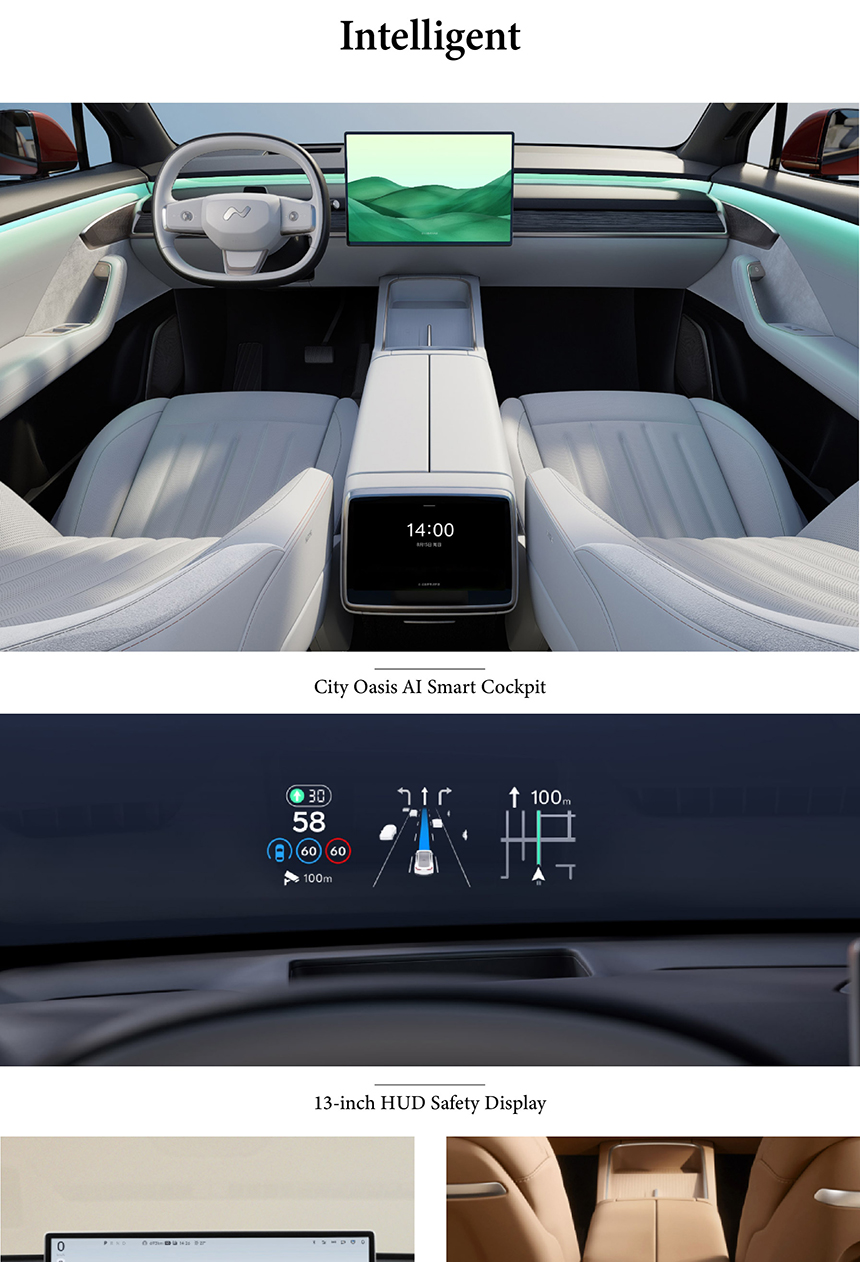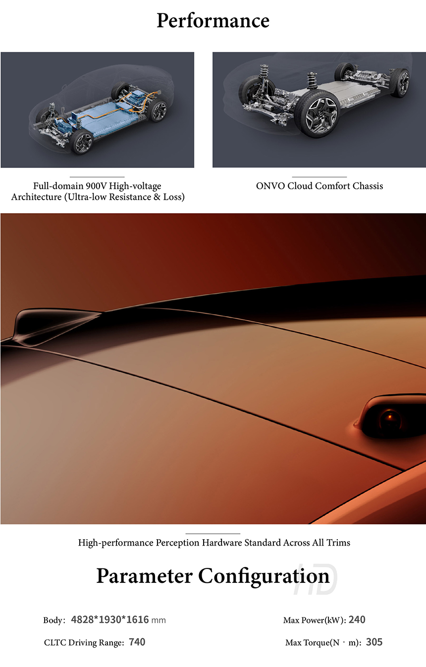 The ONVO L60 presents a modern, aerodynamic design with clean lines and a distinctive lighting signature. Inside, it offers a minimalist, spacious cabin with premium, family-friendly materials and smart storage solutions. Safety is ensured by a high-strength steel body and comprehensive battery protection systems. It delivers intelligent performance with an 900V architecture, ultra-long range, battery-swap capability, and advanced driver assistance for a confident, connected journey.