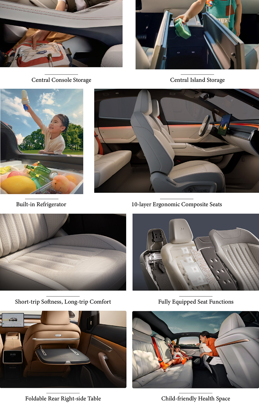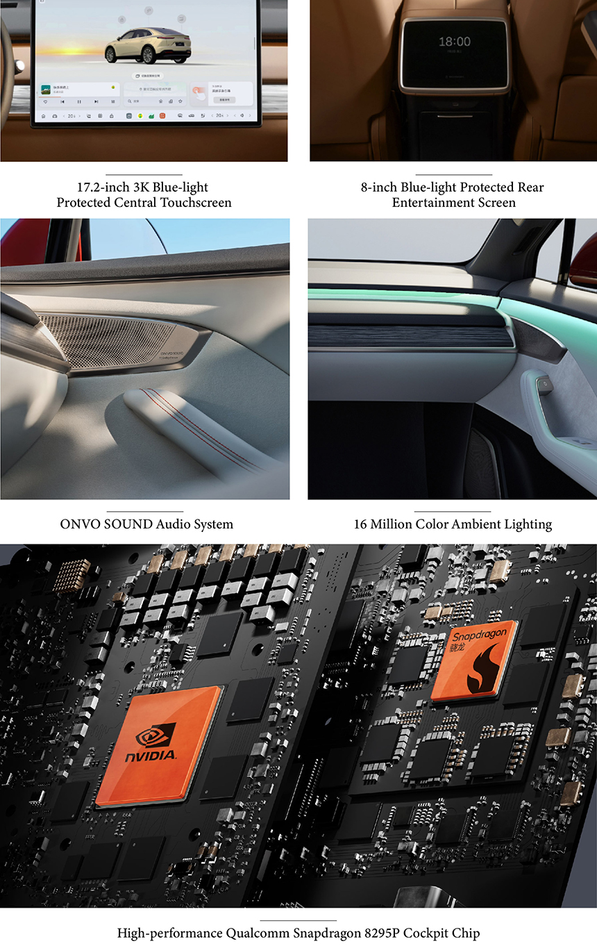 The ONVO L60's intelligent cockpit is powered by the High-performance Qualcomm Snapdragon 8295P Chip, delivering seamless processing and instant responsiveness. A 13-inch HUD Safety Display projects critical driving information directly onto the windshield, keeping your eyes on the road. The 17.2-inch 3K Blue-light Protected Central Touchscreen offers stunning visuals while reducing eye strain during extended use. Together, they create a digitally advanced, safe, and user-centric interface for the modern family.