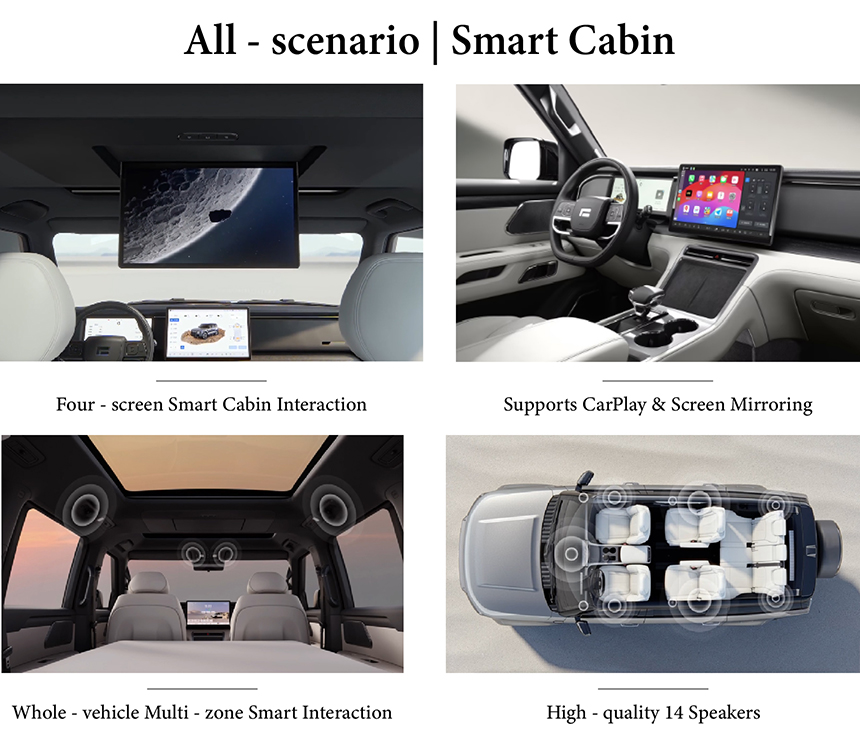 The Polestones 01's intelligent cockpit offers seamless connectivity, supporting CarPlay & screen casting for effortless integration of smartphones and media. It features a premium audio system with 14 high-quality speakers strategically placed to deliver an immersive listening experience. These technologies combine to create a versatile hub for both entertainment and navigation. The result is a modern, connected, and engaging environment for all occupants on every journey.