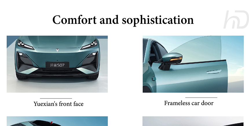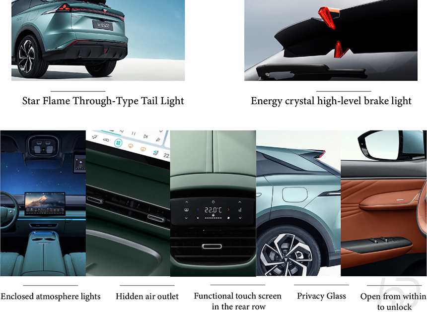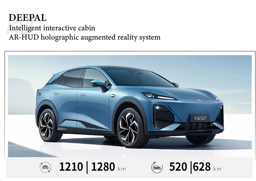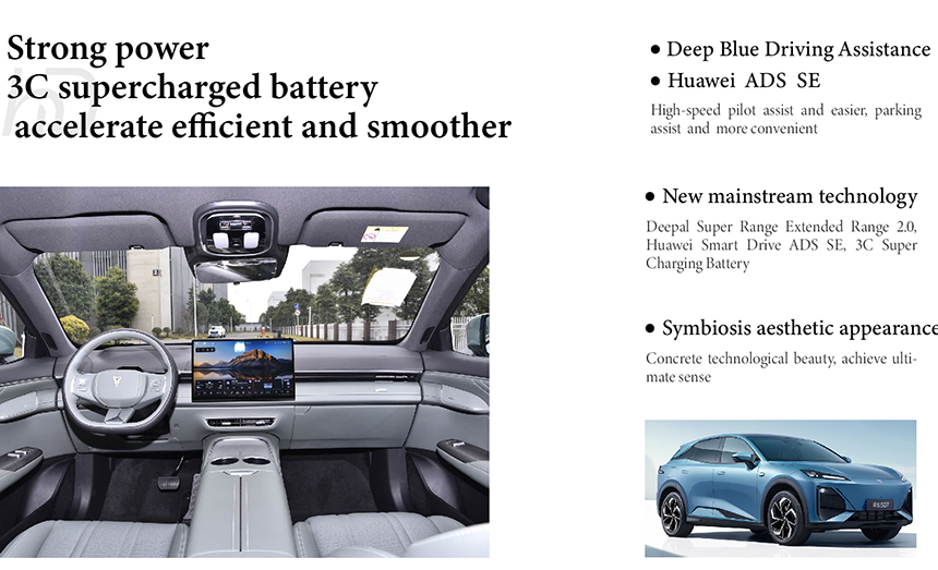 The Deepal S075 features a futuristic cabin with a 15.6-inch floating rotating screen and Star Wing ambient lighting system. Premium vegan leather sports seats integrate heating, ventilation and 8-point massage functions. Sustainable materials and minimalist design create an eco-luxury aesthetic throughout the interior. An intelligent voice assistant and head-up display complete this tech-forward mobile sanctuary.