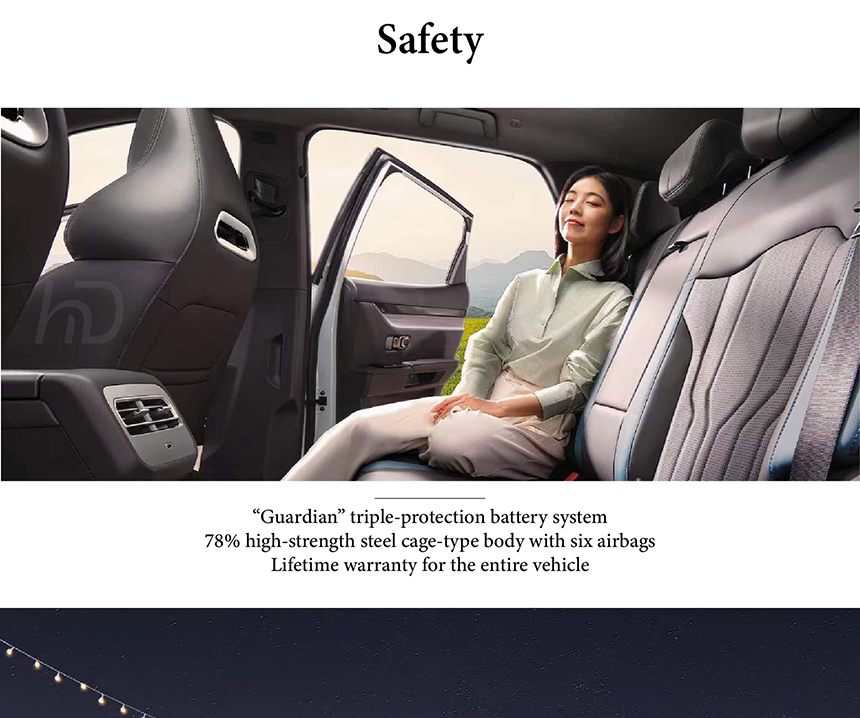 The Jetour Shanhai L6 prioritizes comprehensive safety and reliability, beginning with its robust "Guardian" triple-protection battery system for thermal, electrical, and structural security. This commitment is backed by a lifetime warranty for the entire vehicle, demonstrating exceptional confidence in its long-term quality and durability. Adding to its versatility is a practical 6.6 kW external power discharge capability, enabling safe power supply for outdoor activities. Together, these features provide owners with enduring peace of mind for both everyday use and adventures.