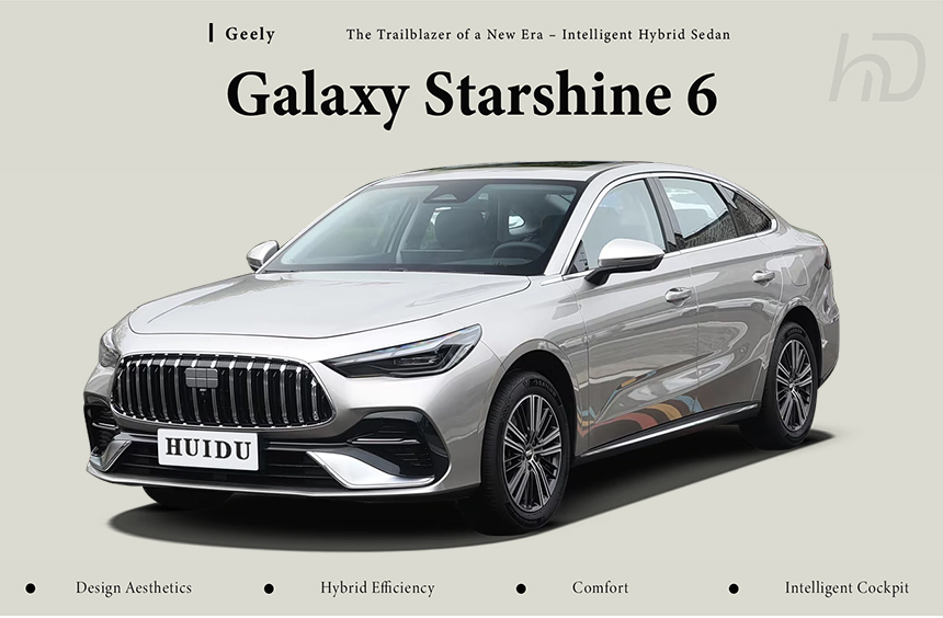 The Geely Galaxy Starshine6 showcases a dynamic and modern design, highlighted by its signature "eye of the tiger" LED headlights, a striking silver front grille, and distinctive red taillights. Inside, it offers a spacious and tech-forward cabin with premium comfort seats, a clean layout enabled by the GEEA 3.0 electronic architecture, and a dual-screen digital cockpit. Safety is assured by a high-strength body structure and a comprehensive suite of driver-assistance features built upon the robust GEA globalEV platform. Intelligent connectivity and driving are delivered through the large 14.6" center touchscreen, digital instrument cluster, and the advanced "Galaxy Pilot" assistance system, ensuring a secure and connected driving experience.
