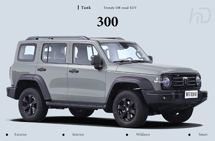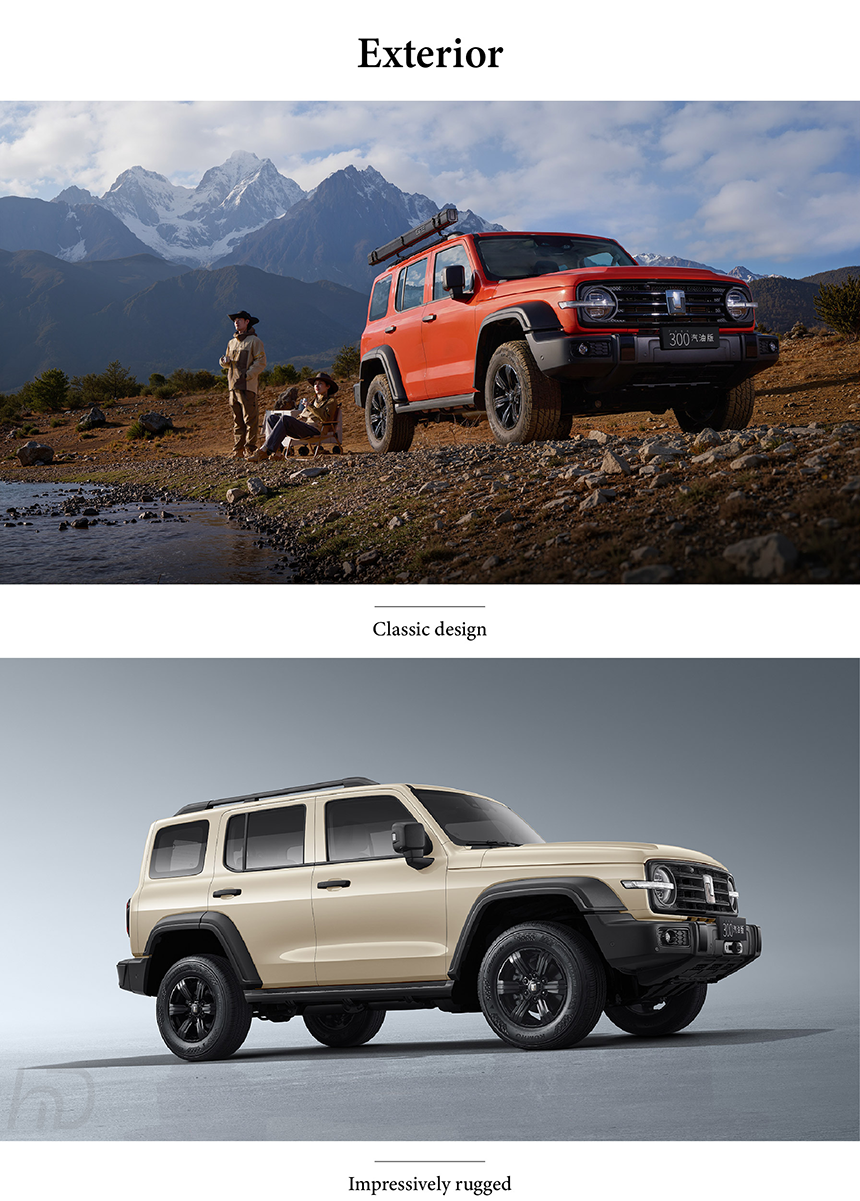 Tank 300's exterior masterfully blends classic boxy design with rugged capability, featuring a bold grille, circular LED headlights, and muscular wheel arches that balance retro charm with modern sophistication for both urban and off-road adventures.