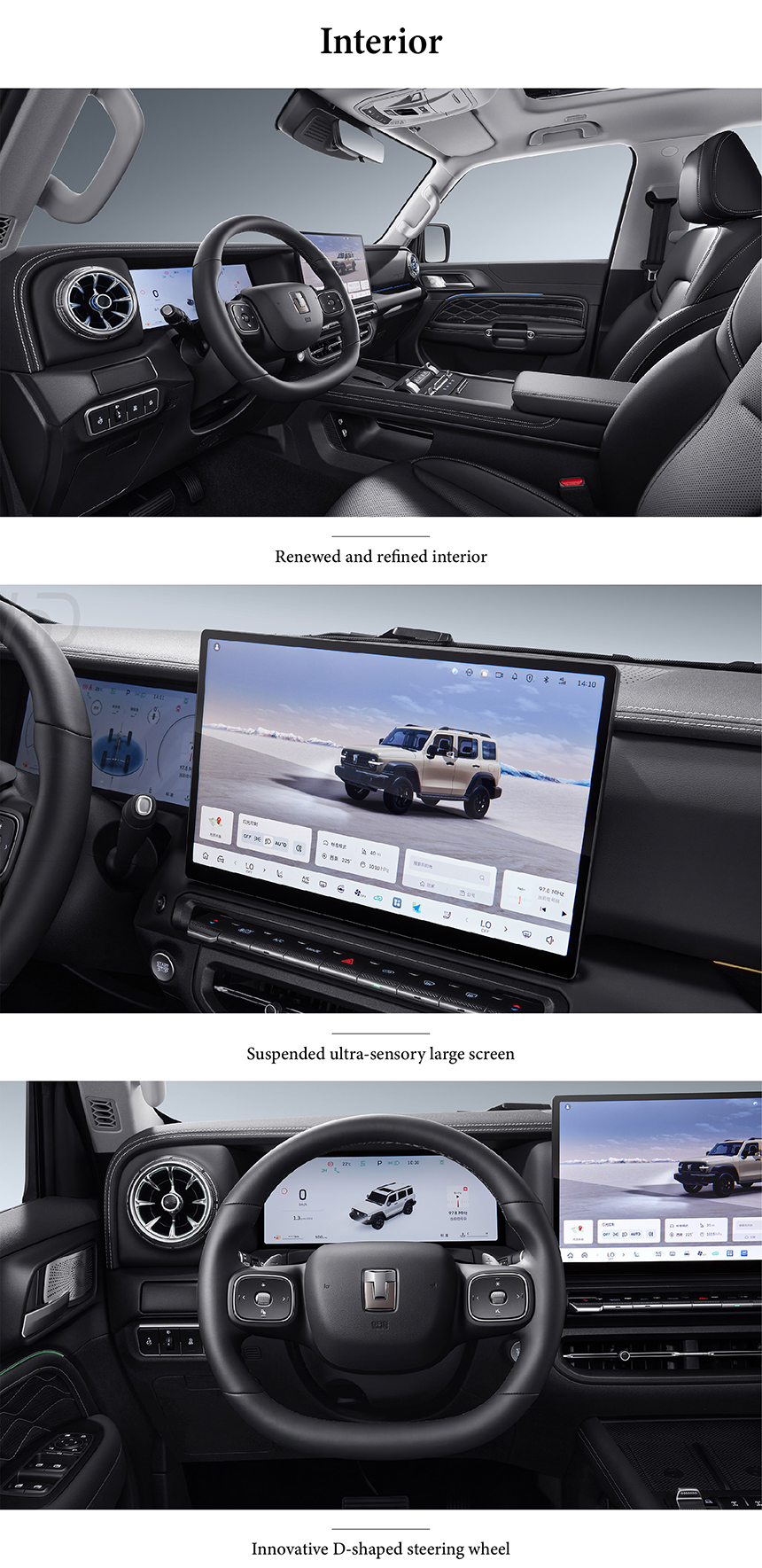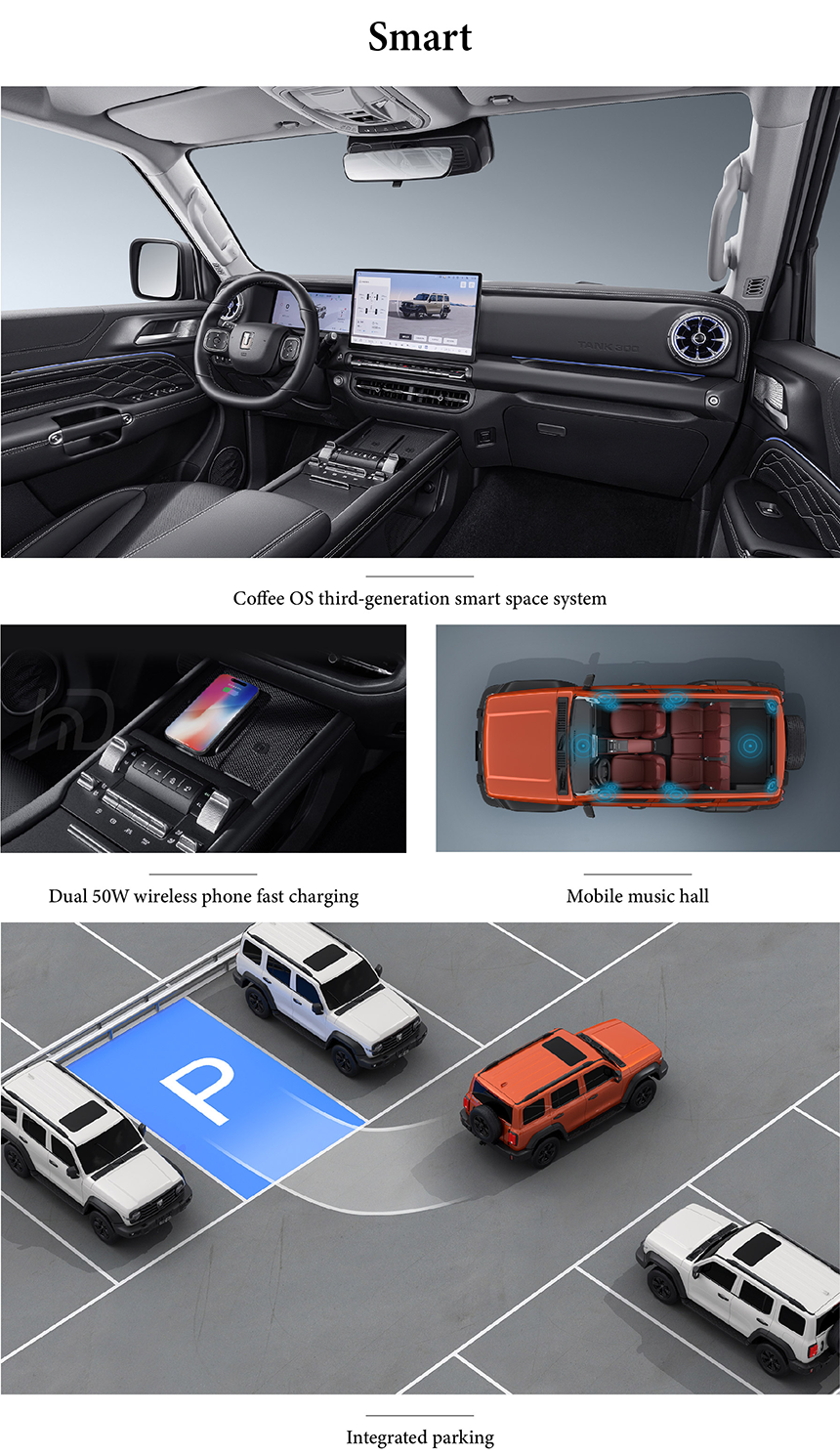 The Tank 300 features the innovative Coffee OS third-generation smart space system, delivering an intuitive and connected driving experience. Its dual 50W wireless phone fast charging ensures both driver and passenger stay powered up on the go. An immersive mobile music hall transforms the cabin into a premium acoustic environment. The integrated parking system makes maneuvering effortless in any urban or off-road scenario.