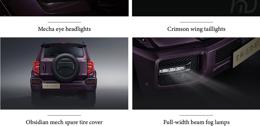 The Tank 400 Hi4-T Zhixiang Edition commands attention with its wide-body floating front and rear bumpers, creating a formidable road presence while enhancing approach and departure angles. Its aggressive 18-inch battle-blade alloy wheels deliver exceptional traction and cutting-edge visual appeal for both on-road refinement and off-road capability. The distinctive obsidian mech spare tire cover combines rugged durability with sophisticated aesthetics, serving as a striking visual centerpiece. These purpose-driven design elements work in harmony to establish a perfect balance of futuristic styling and uncompromising off-road functionality.