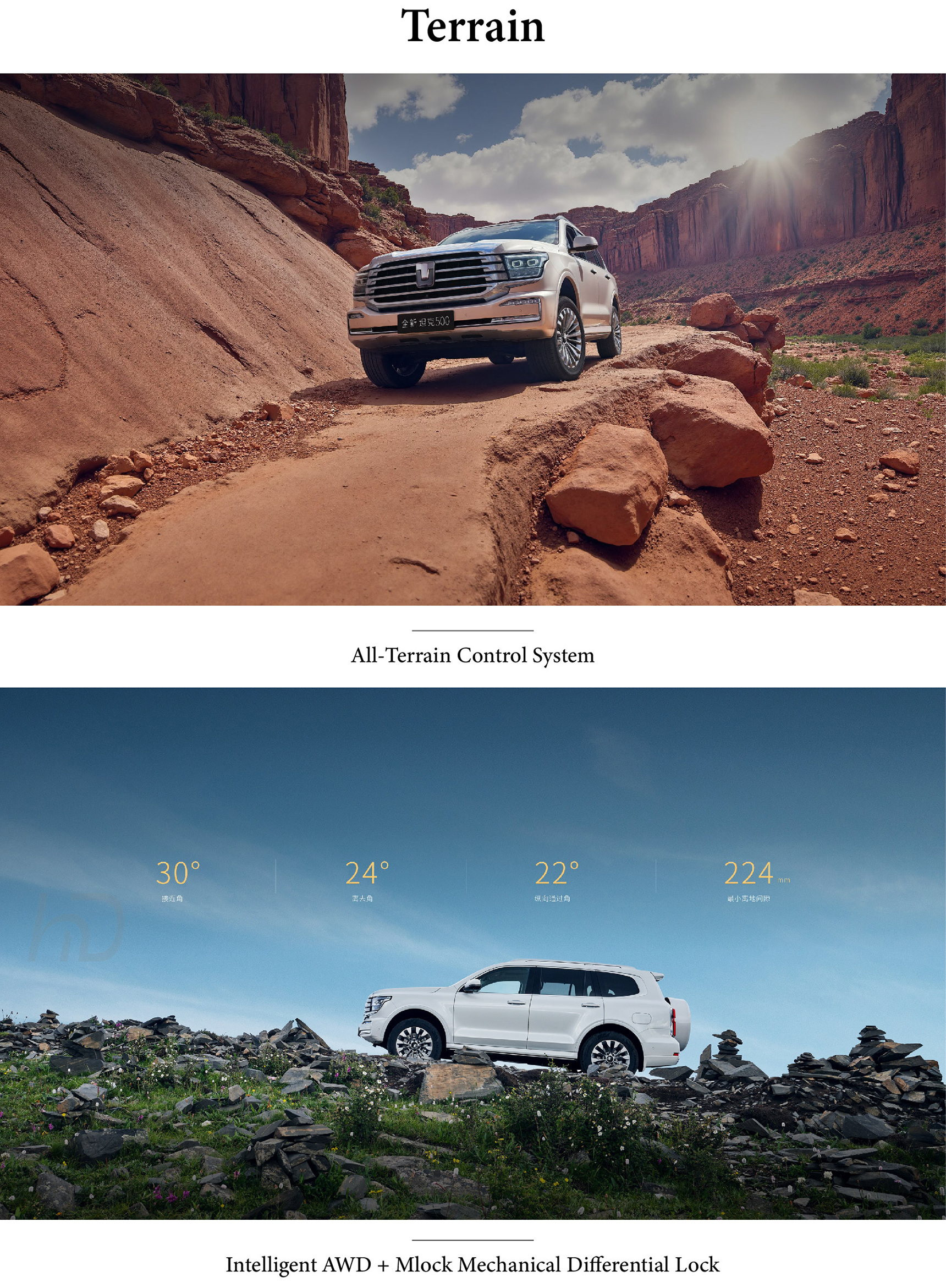 The Tank 500 3.0T is engineered for ultimate off-road mastery, governed by its sophisticated All-Terrain Control System that optimizes vehicle dynamics for diverse surfaces. This intelligent system seamlessly coordinates with the robust Intelligent AWD + Mlock Mechanical Differential Lock to deliver maximum traction and formidable escape capability. The result is exceptional grip and durability in challenging conditions, from rocky trails to sandy dunes. It empowers drivers to confidently conquer off-road adventures while maintaining refined on-road composure.