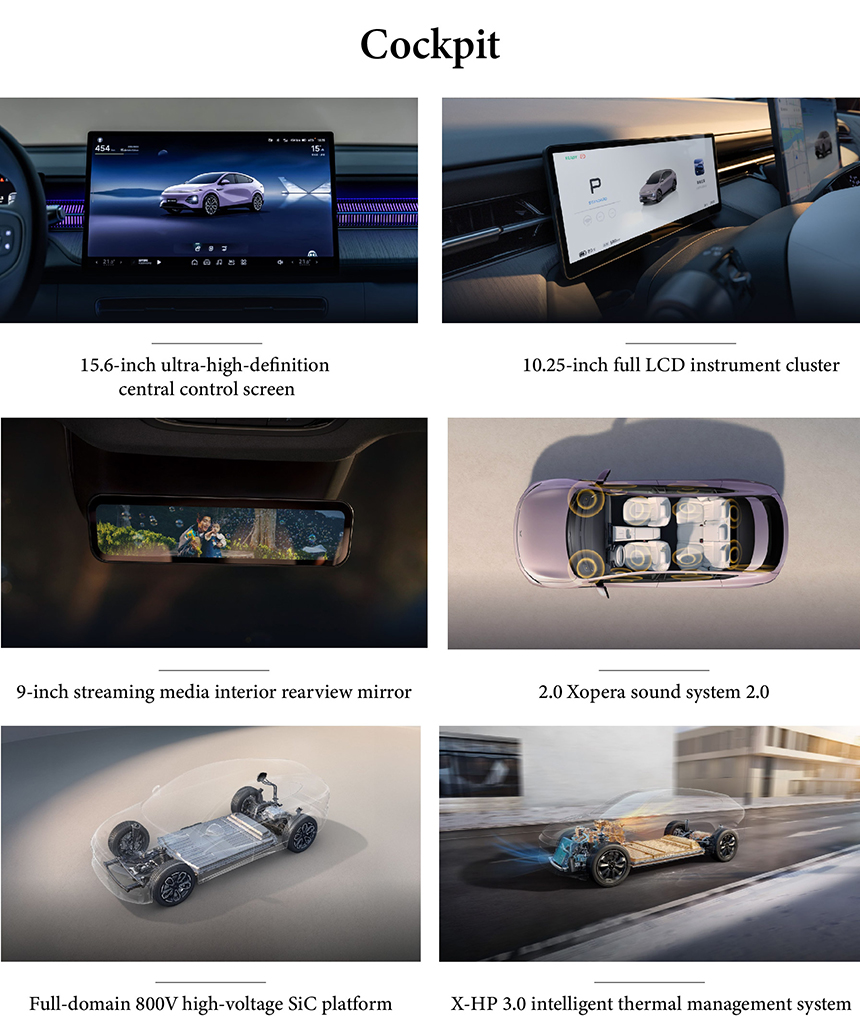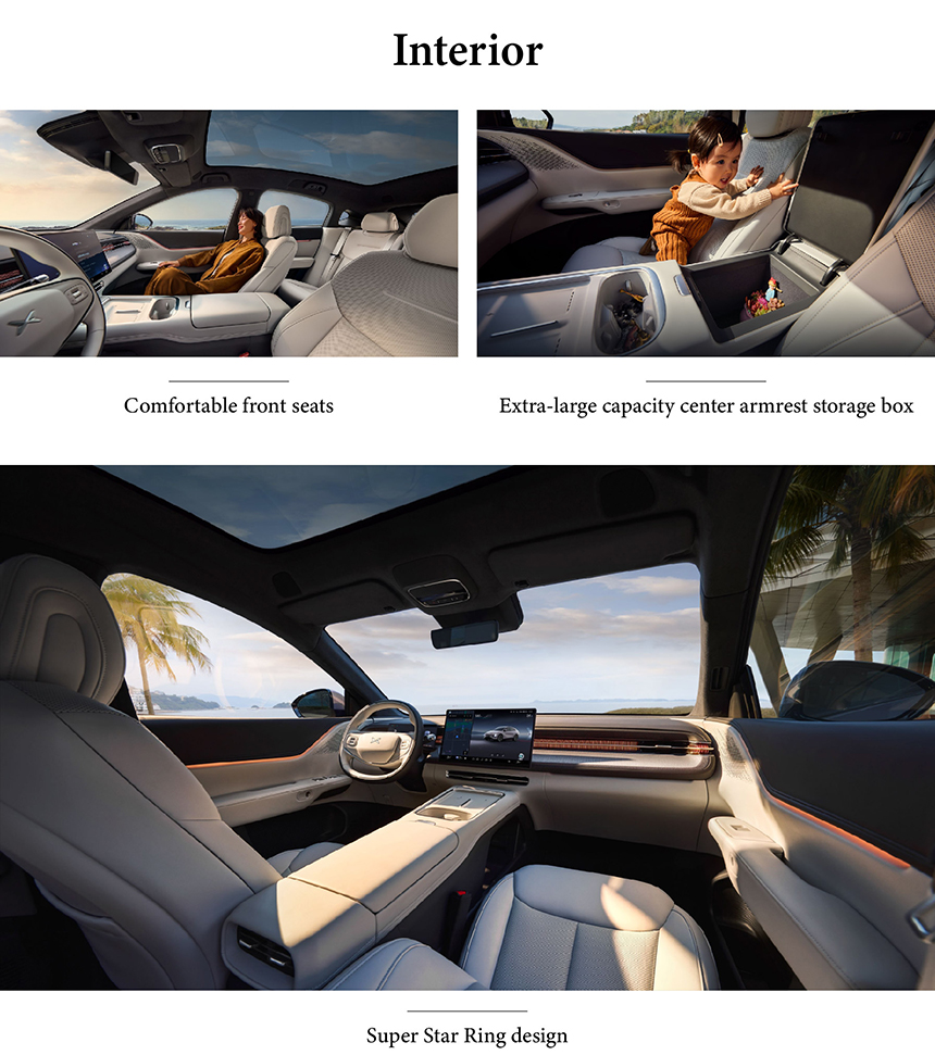 The interior of the XPENG G6 prioritizes a harmonious blend of driver-centric comfort and futuristic aesthetics. It is equipped with ergonomically designed comfortable front seats that provide excellent support for both daily commutes and longer journeys. The cabin's visual centerpiece is the captivating Super Star Ring design, a sculptural element that integrates ambient lighting and air vents, creating a truly immersive and technologically advanced atmosphere. Adding to everyday practicality is the versatile extra-large capacity center armrest storage box, offering ample and convenient space for personal items.