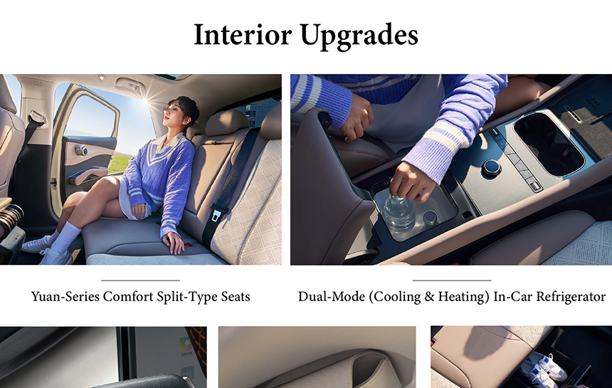 The BYD Yuan Plus receives a thoughtful interior upgrade, starting with newly designed Yuan-Series comfort split-type seats that offer enhanced support for both daily commutes and long-distance travel. Adding to the convenience is a dual-mode (cooling & heating) in-car refrigerator, perfect for keeping drinks and snacks at the ideal temperature on any journey. These premium features, combined with the brand's signature cultural-inspired design elements, create a cabin environment that prioritizes both passenger well-being and modern practicality.